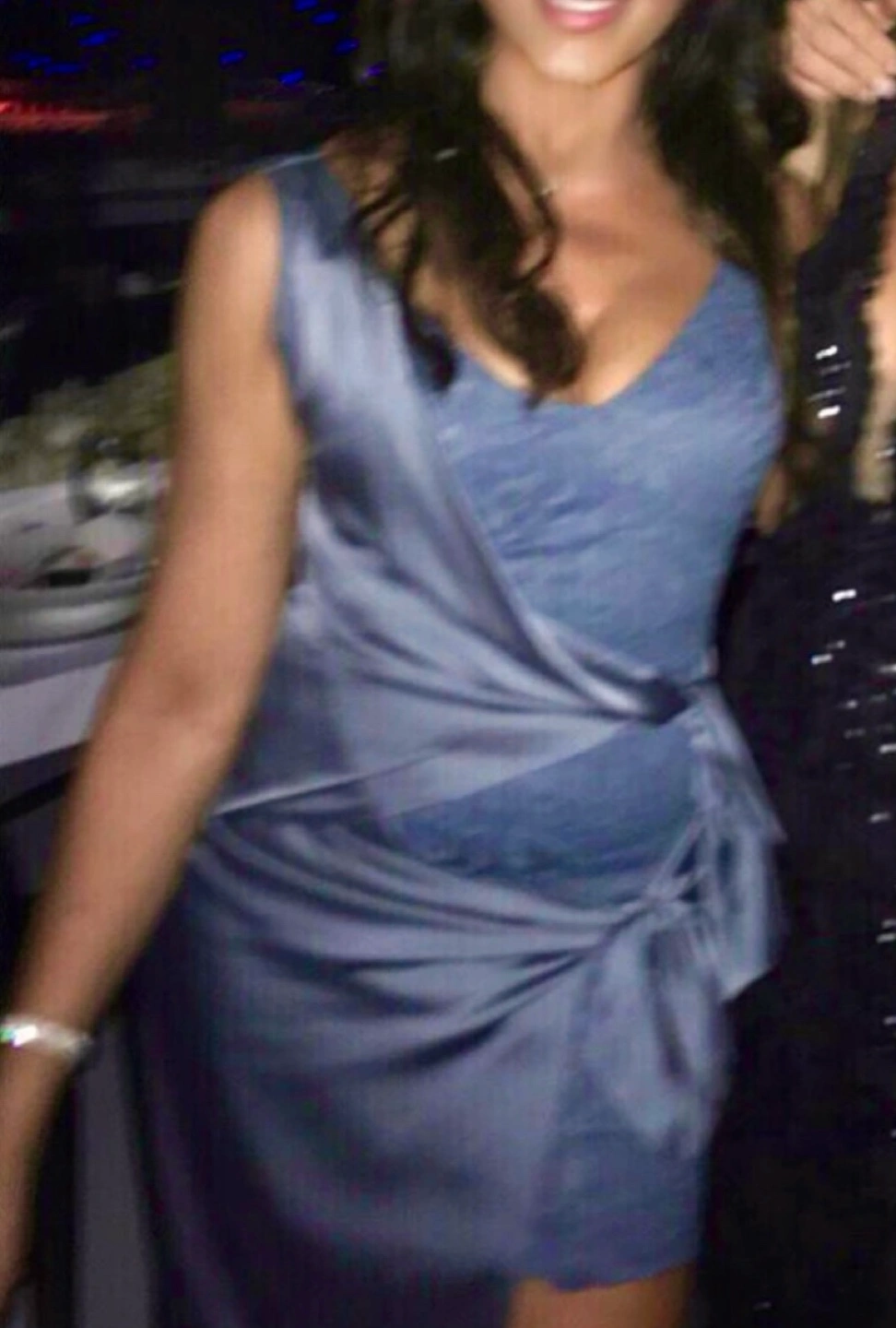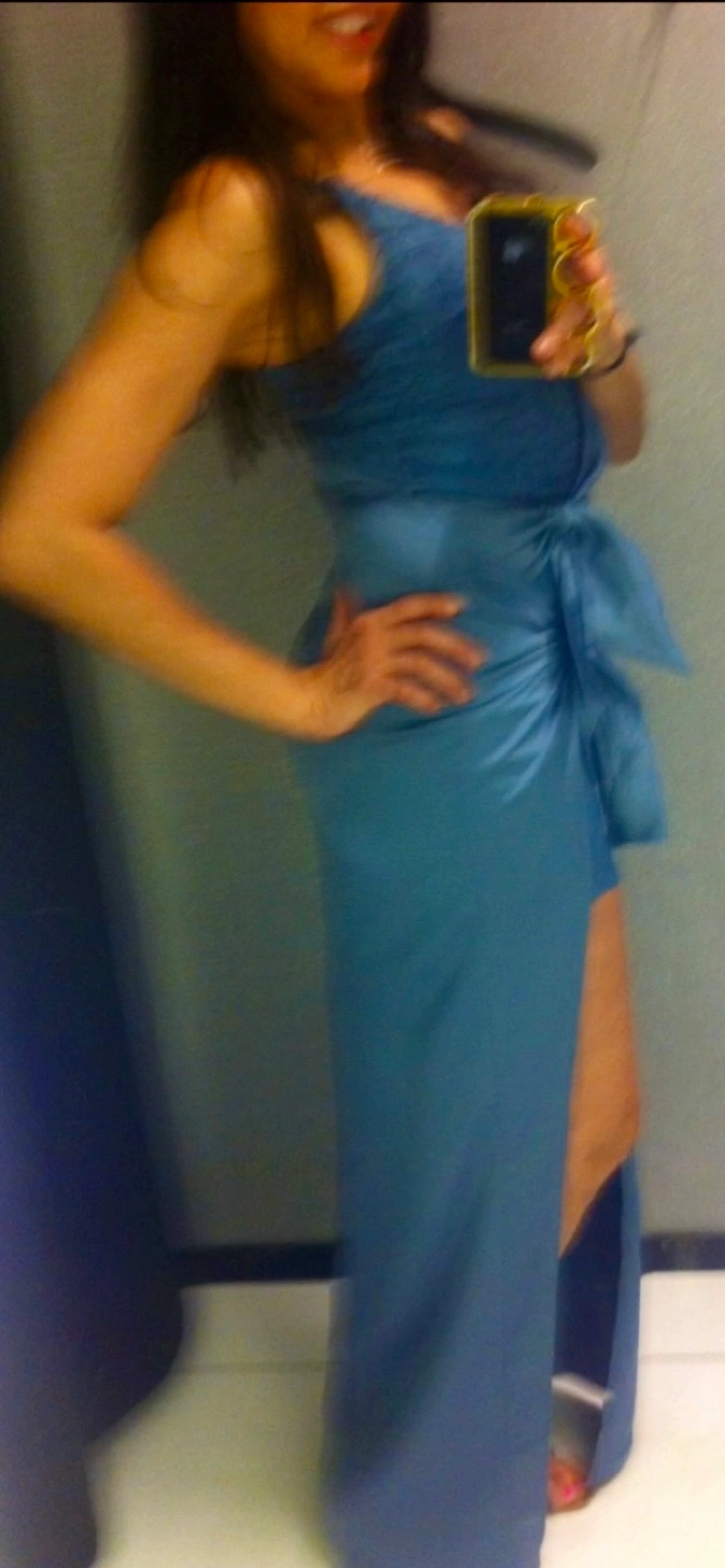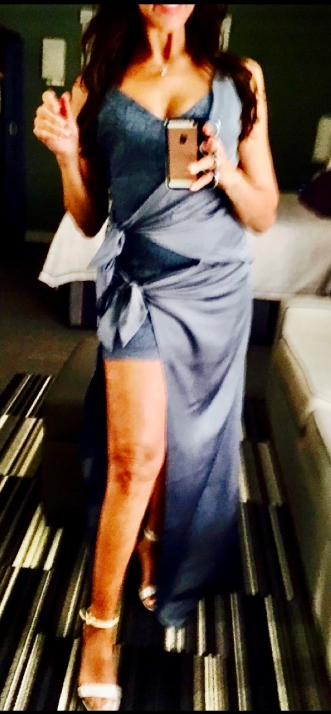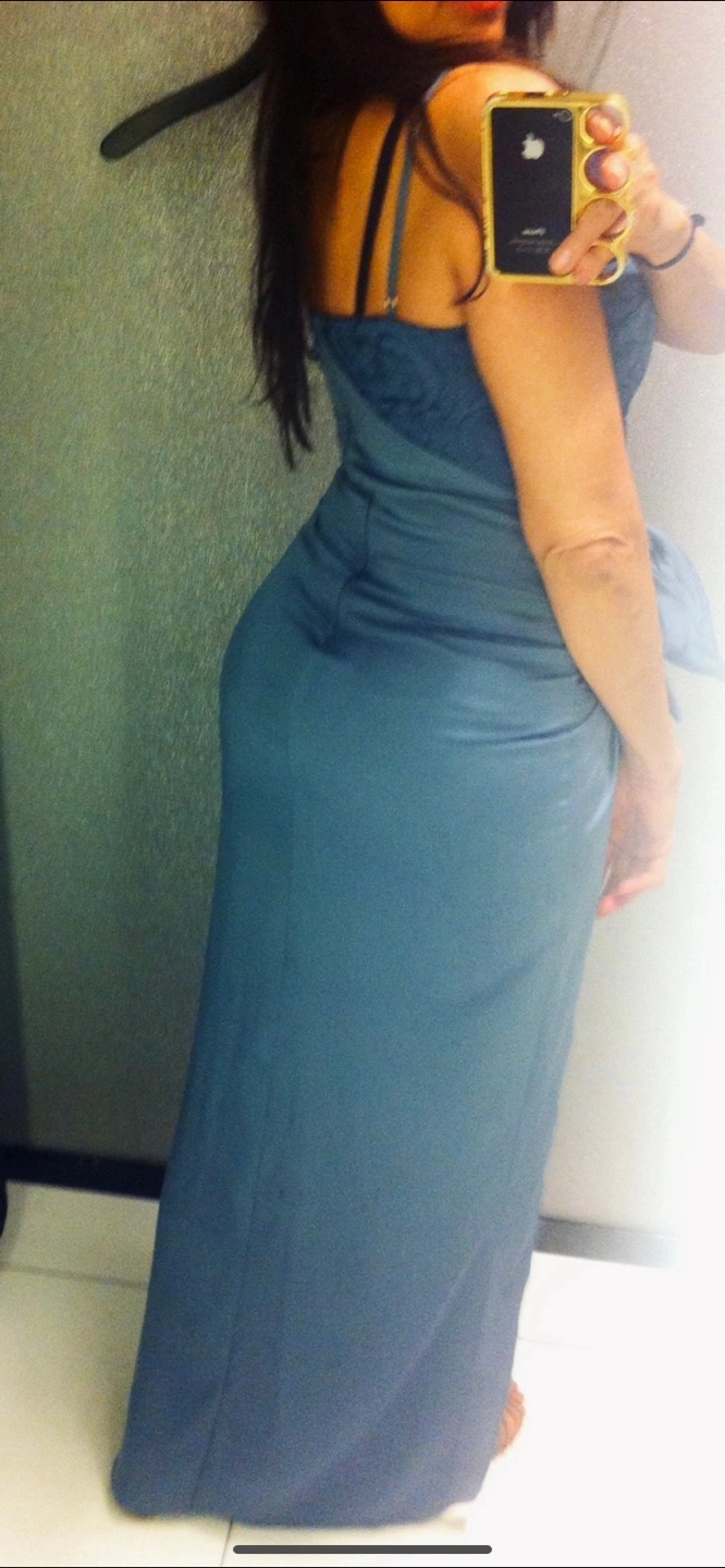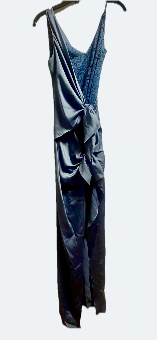 Gorgeous blue maxi dress. Features a satin overlay, lace short bodice attached and thigh high open front on one side. Wrap style with a bow detail. Perfect for a special occasion.
