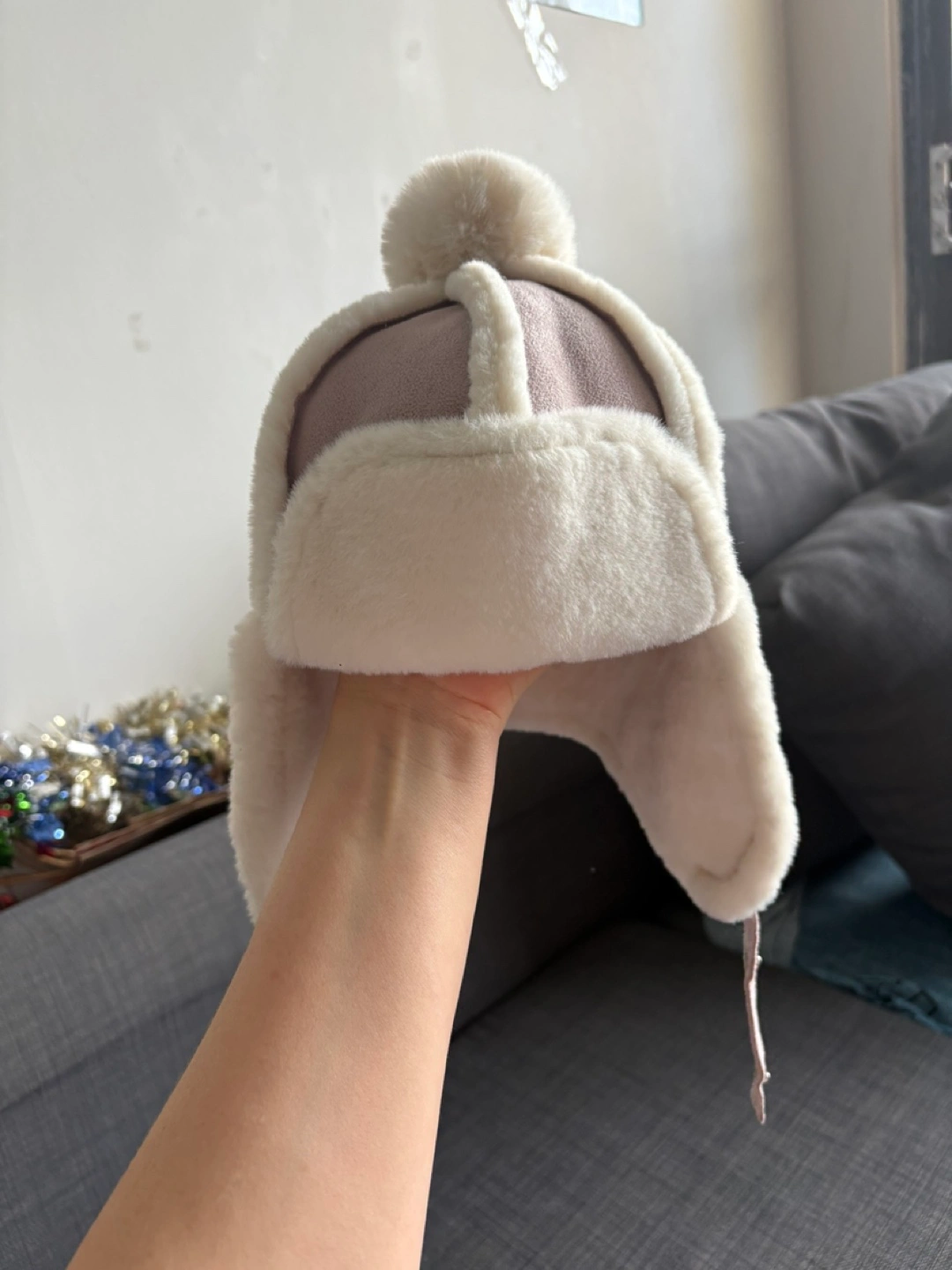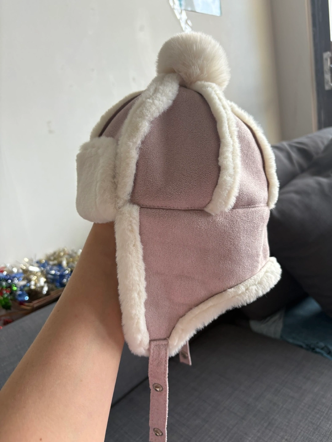 Super cute baby trapper hat. White faux fur trim and pompom. Ear flaps. Perfect for winter.