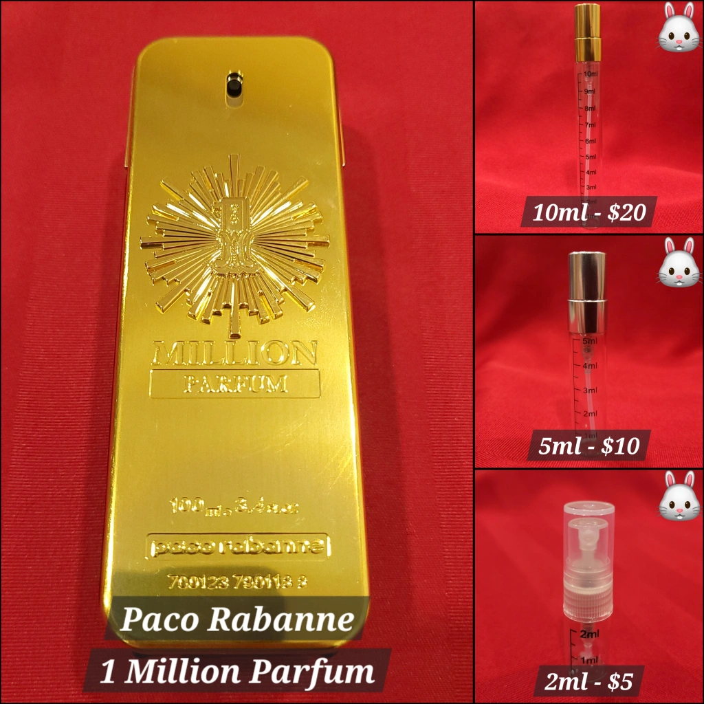 1 Million Parfum decants available. 10ml, 5ml and 2ml sizes. Prices listed in the image.