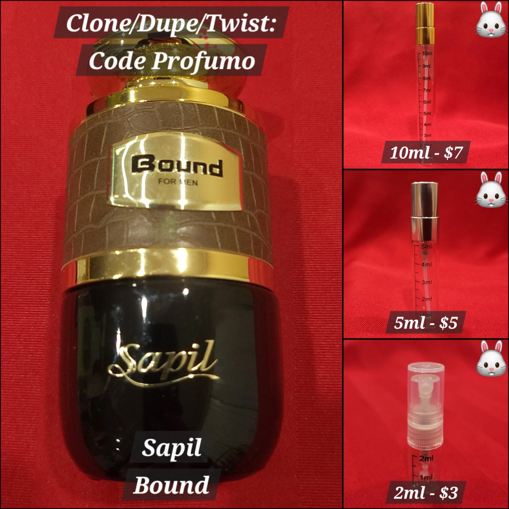 Sapil Bound men's fragrance, a Code Profumo clone. Available in 10ml, 5ml and 2ml sizes. Decant options shown.