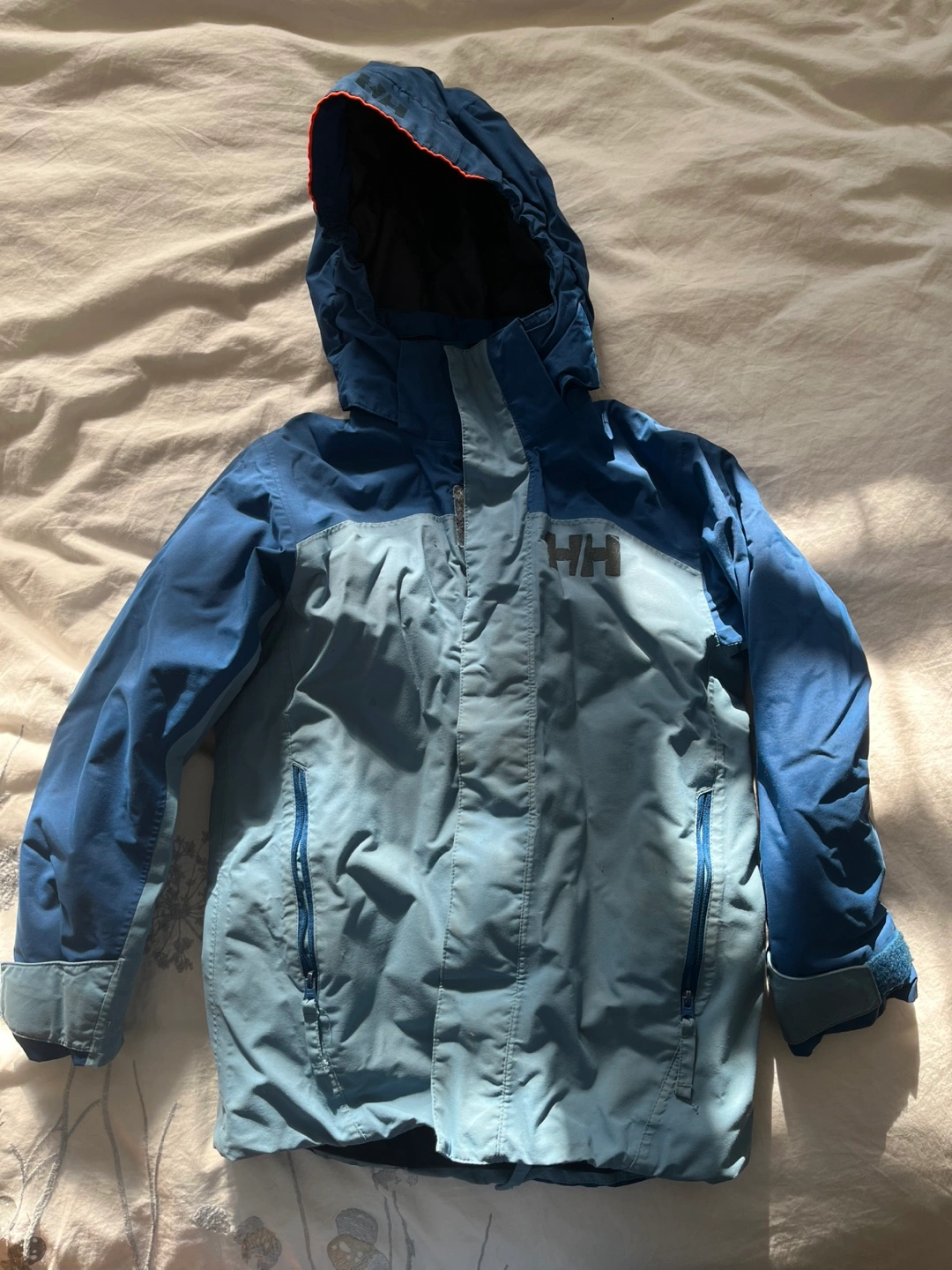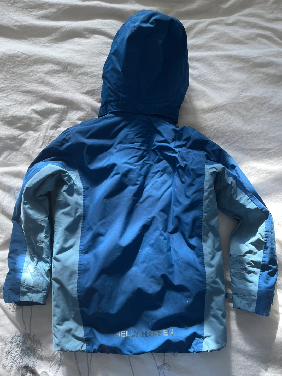 Blue and light blue Helly Hansen kids' ski jacket. Size 128/8. Features a hood. Designed and developed in Norway since 1877.
