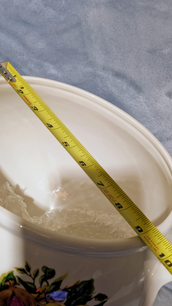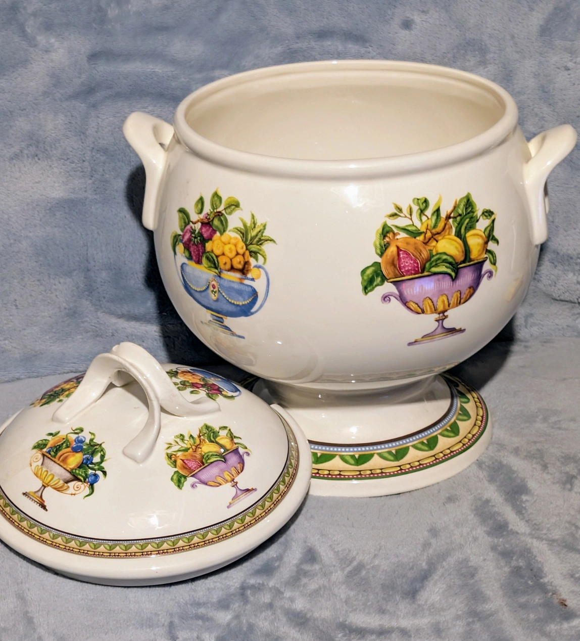 Beautiful vintage tureen. Features a pedestal base and two handles. Lid included. Large capacity. Fruit and urn design.
