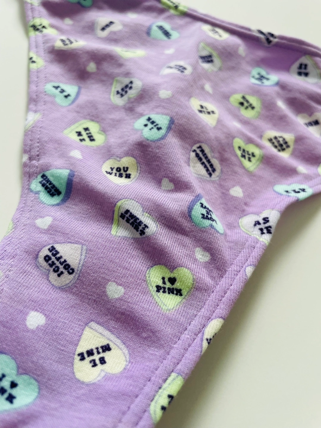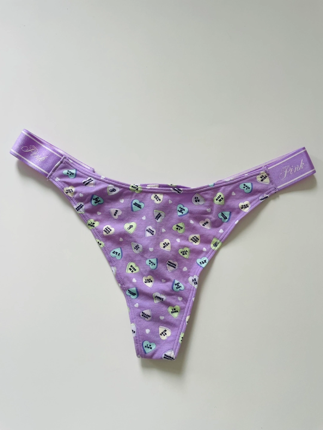 Lavender thong underwear. Features a candy hearts pattern and 'Pink' waistband. Soft cotton material. Adorable Valentine's Day lingerie. Cash & Pick up only. (King & Blue Jays Way) If the price isn't set to fixed, feel free to make an offer!