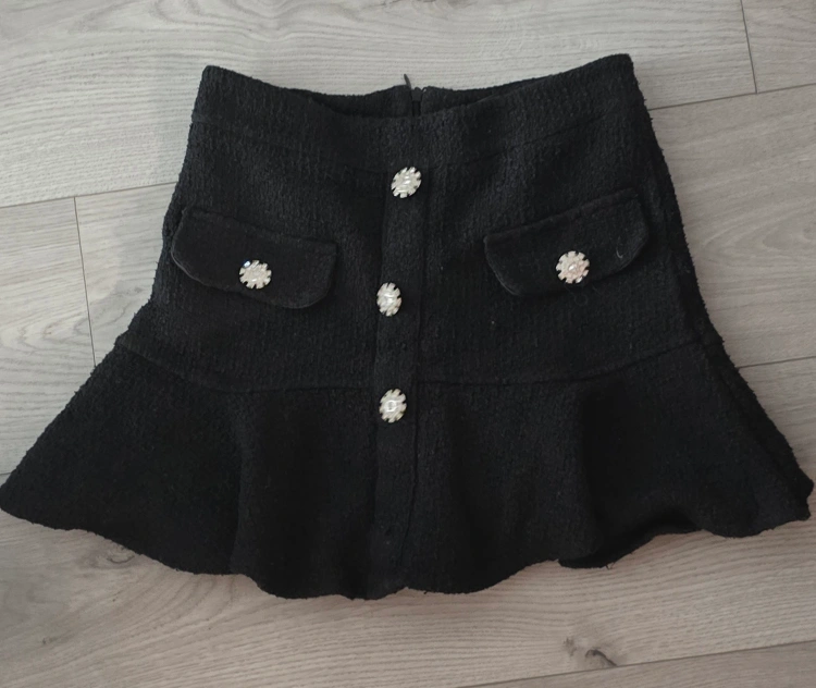 Women's black mini skirt. Tweed fabric. Features embellished buttons and a flared hem. Zipper closure. Price negotiable & open to trades. Delivery possible to most line 1 and line 2 stations.