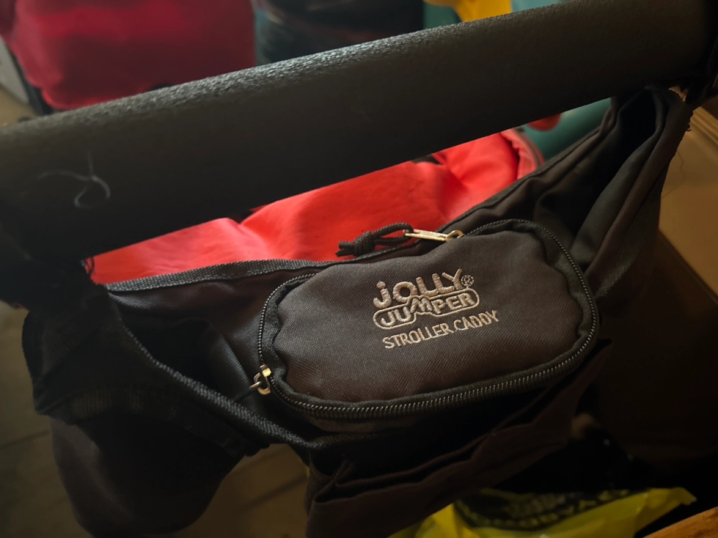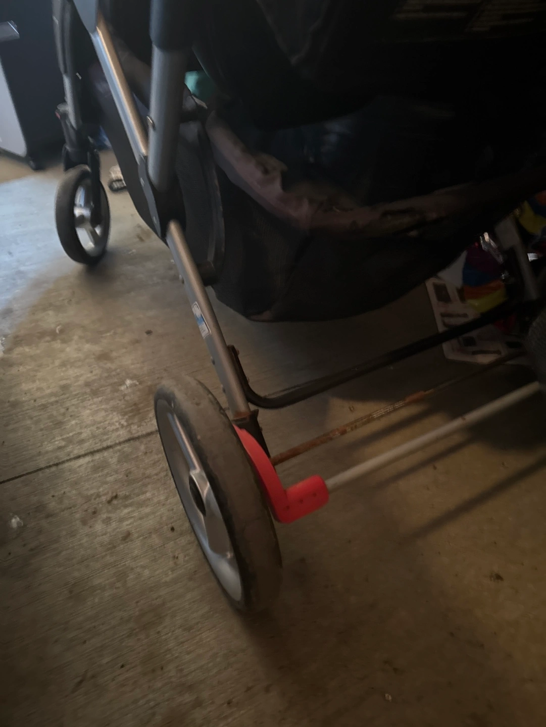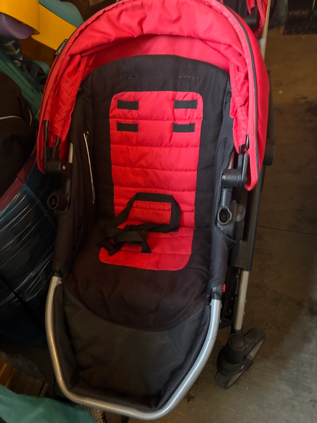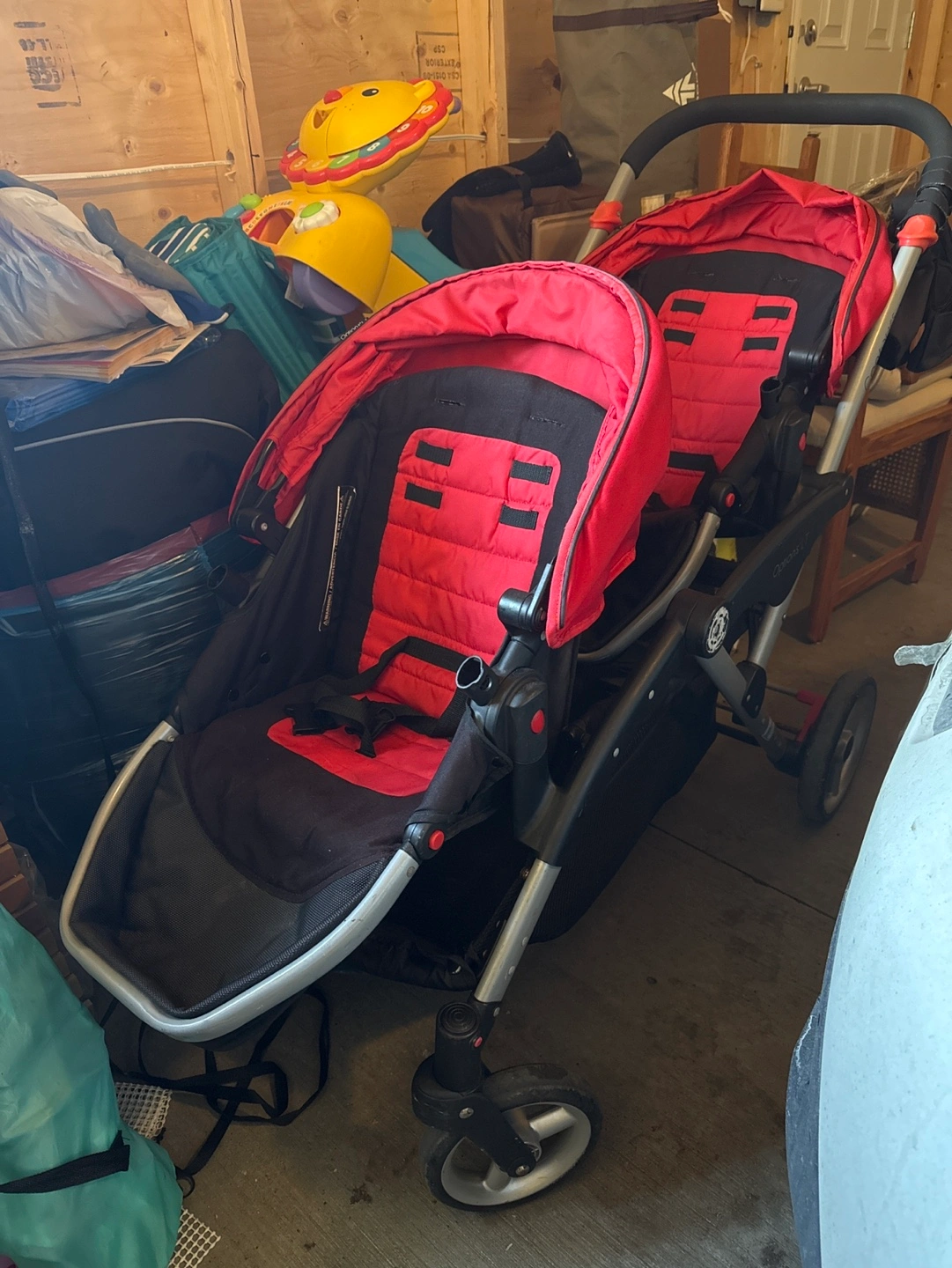 Options Contours double stroller. Red and black colour scheme. Easily Detachable. Includes stroller caddy. Some wear and tear.