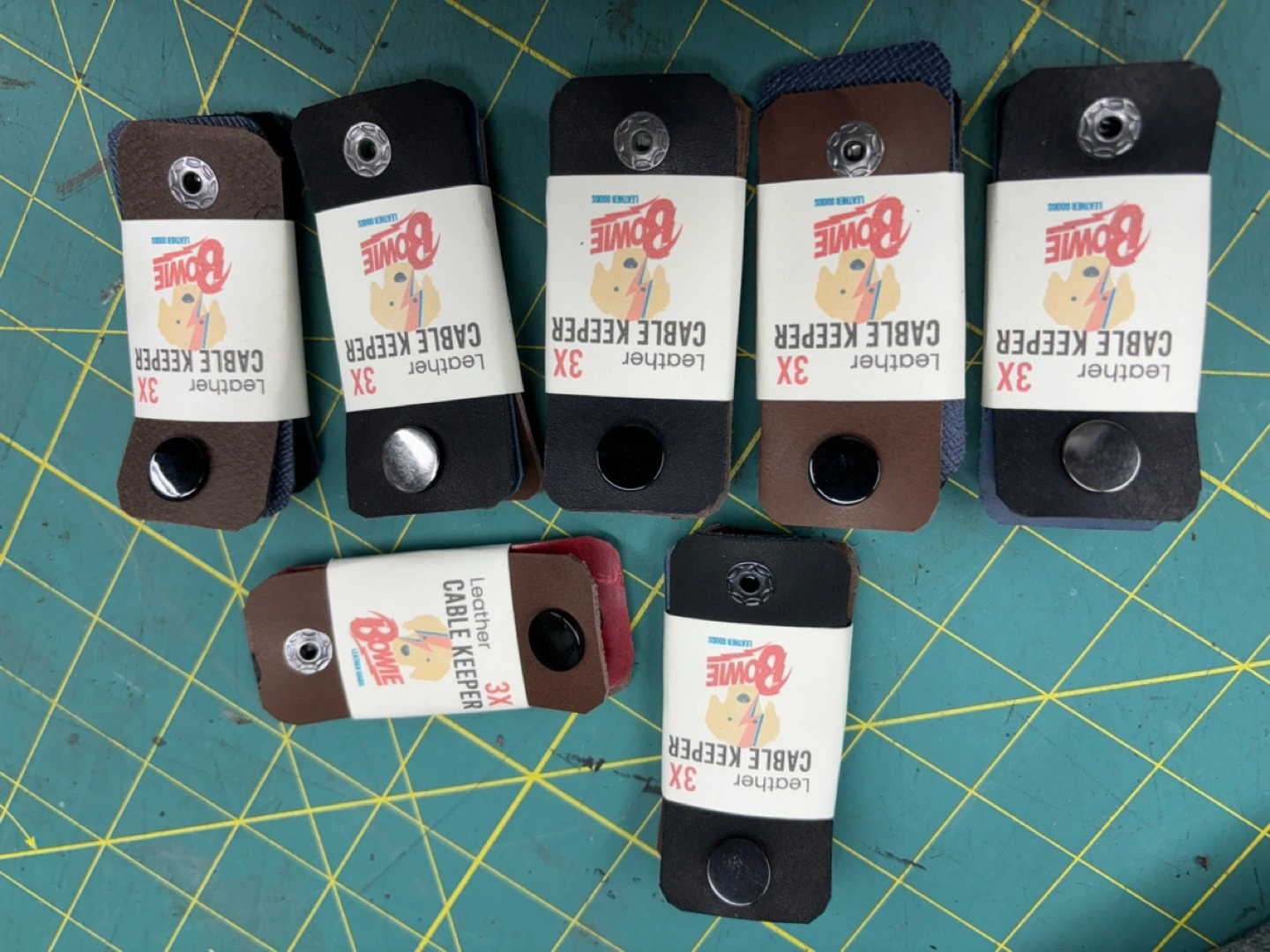 Set of 3 leather cable keepers. Each features a Bowie-themed label. Brown, black, and dark blue leather options. Metal fasteners. $3 per pack of 3