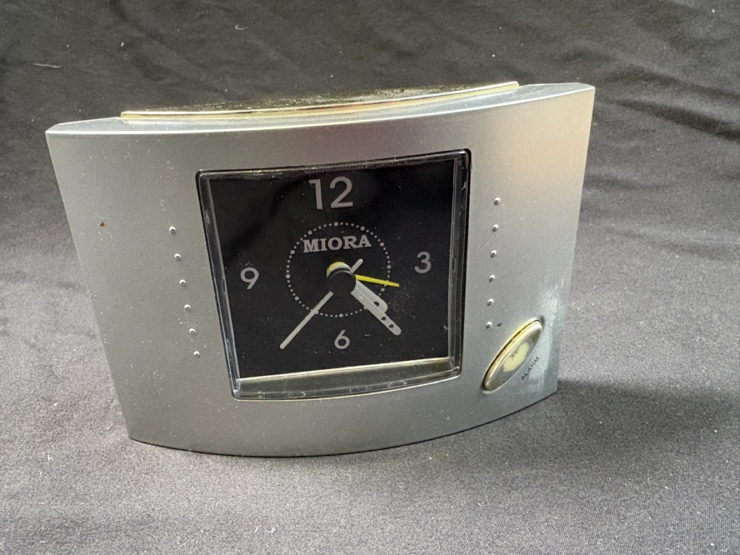 Good condition Silver-toned alarm clock. Features a curved design, snooze and light functions. Battery operated. Shows time using analogue hands $1 Pick up Victoria park & O’Connor area
