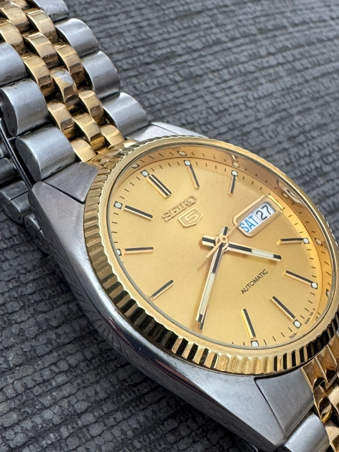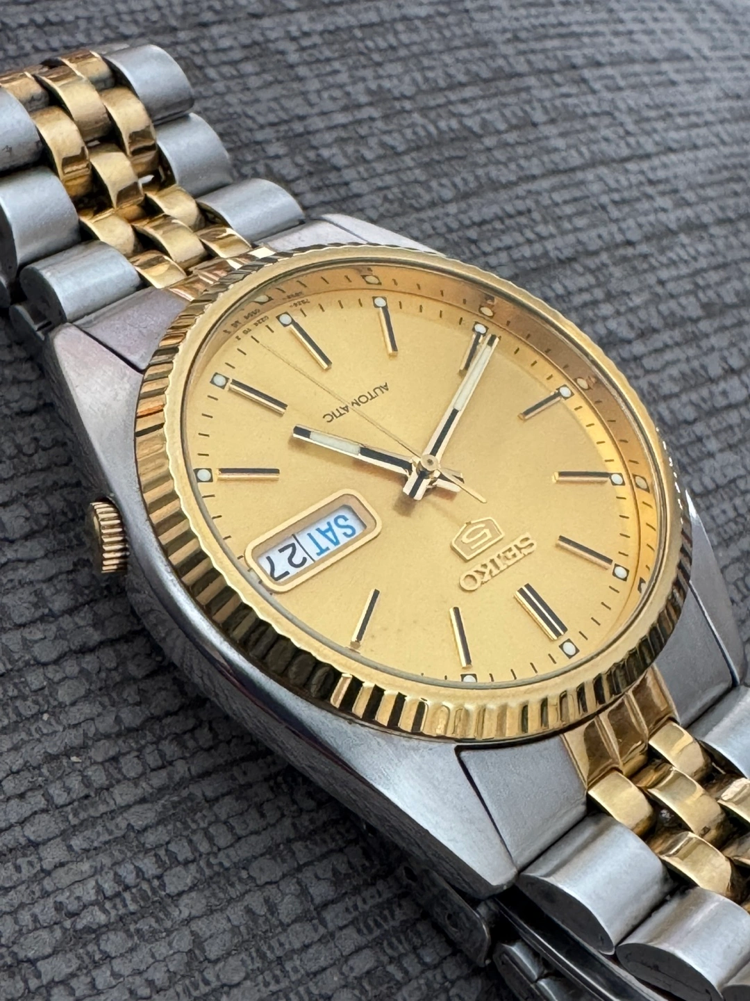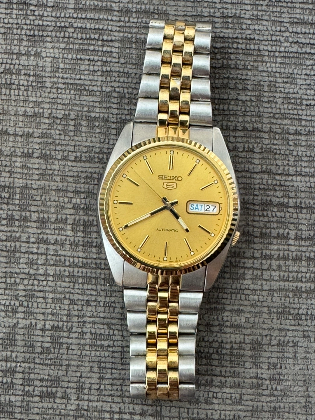 PLEASE READ DESCRIPTION FOR DETAILS AND SIZING BEFORE BUYING - Rare Seiko 5 Day-Date with fluted bezel - All original - Excellent condition - ref. SNXJ92 - 36mm case size, bracelet fits up to 8” wrist - Automatic - Two-tone Pickup Markham or downtown Toronto. No holds without deposit, first come first served. If you like this watch, check out my other listings for similar watches! Buy multiple for a small discount