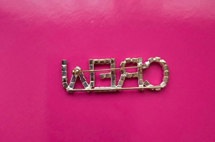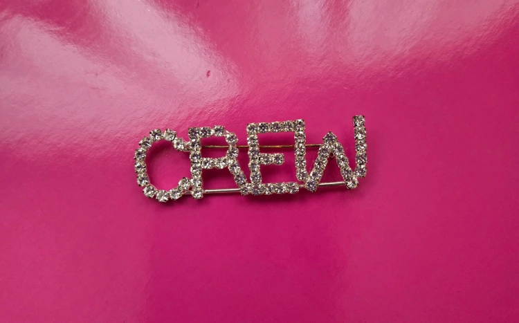 Pin features the word CREW in rhinestones. Great accessory for adding a touch of sparkle.