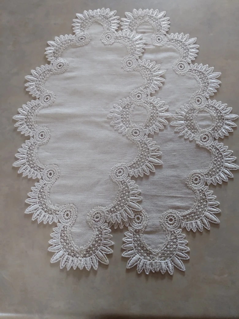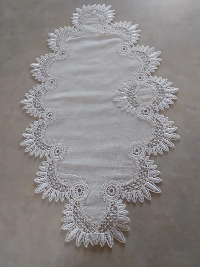 Lovely set of two delicate white lace table runners. Elegant and classic design. Perfect for adding a touch of refinement to your home décor. Adds charm to any table setting.