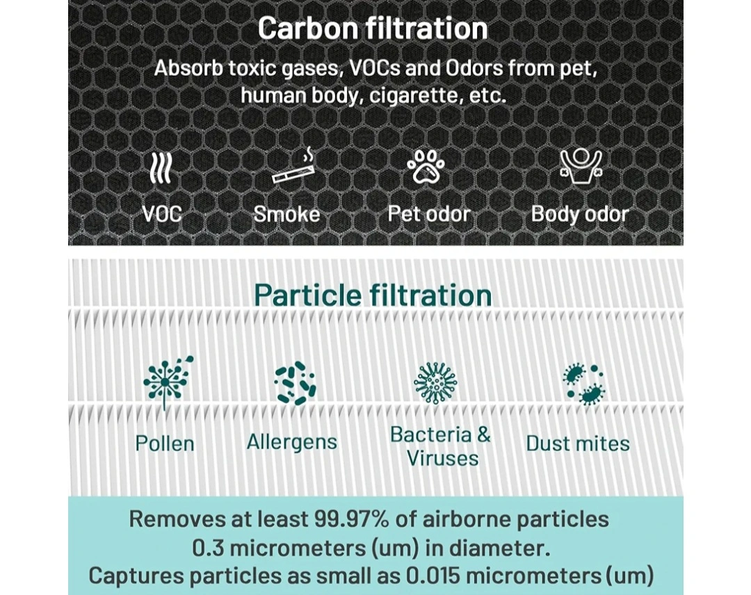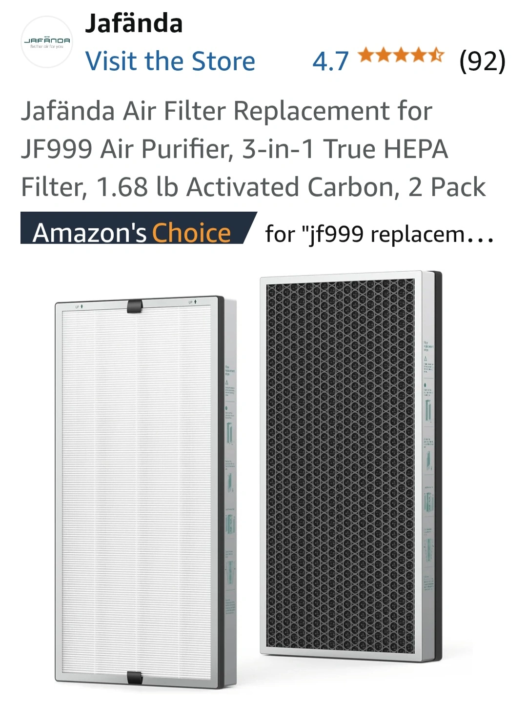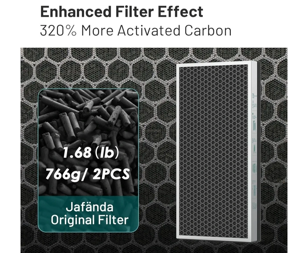 Two Jafända Replacement Filters FOR the JF999 AIR PURIFER. 3-in-1 True HEPA filter with activated carbon. Measures 21.6" x 11" x 1.8". Removes Dust, Pollen, Smoke, Bacteria, Pet Odours, VOCs, and Allergens.