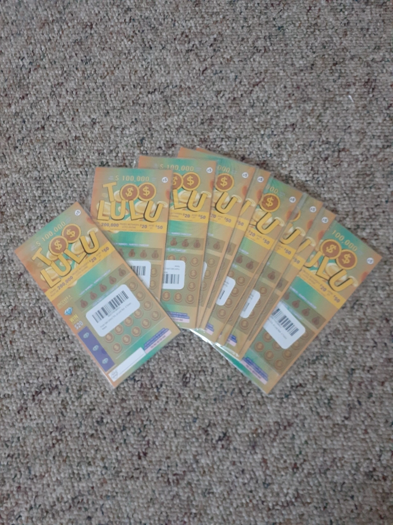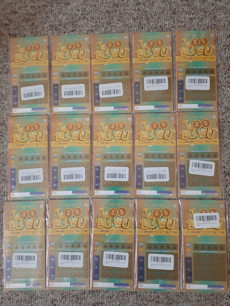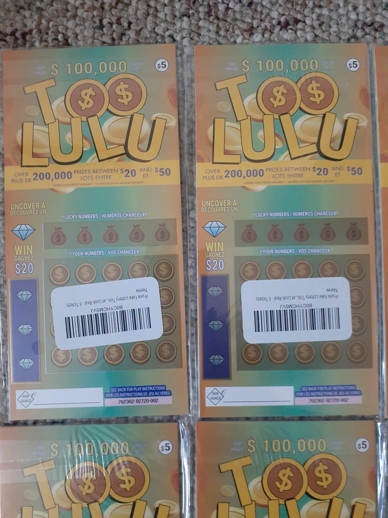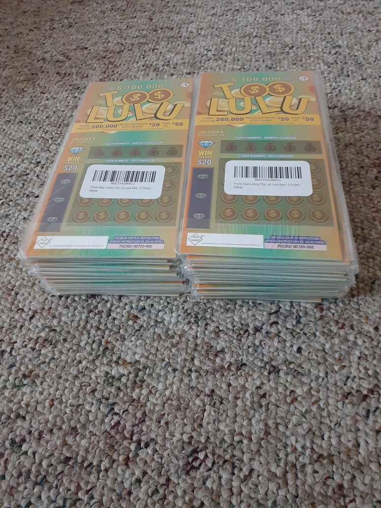 Bulk lot of PRANK FAKE scratch tickets. Great gag gift. $100,000 Lulu scratch-off design. Looks realistic. Fun prank to trick friends each pack comes with 6 tickets buy 1 pack $3 buy 4 packs $10 - get 1 pack free buy 10 packs $25 - get 3 packs free if buying more willing to negotiate 65 packs in total take them all for 100