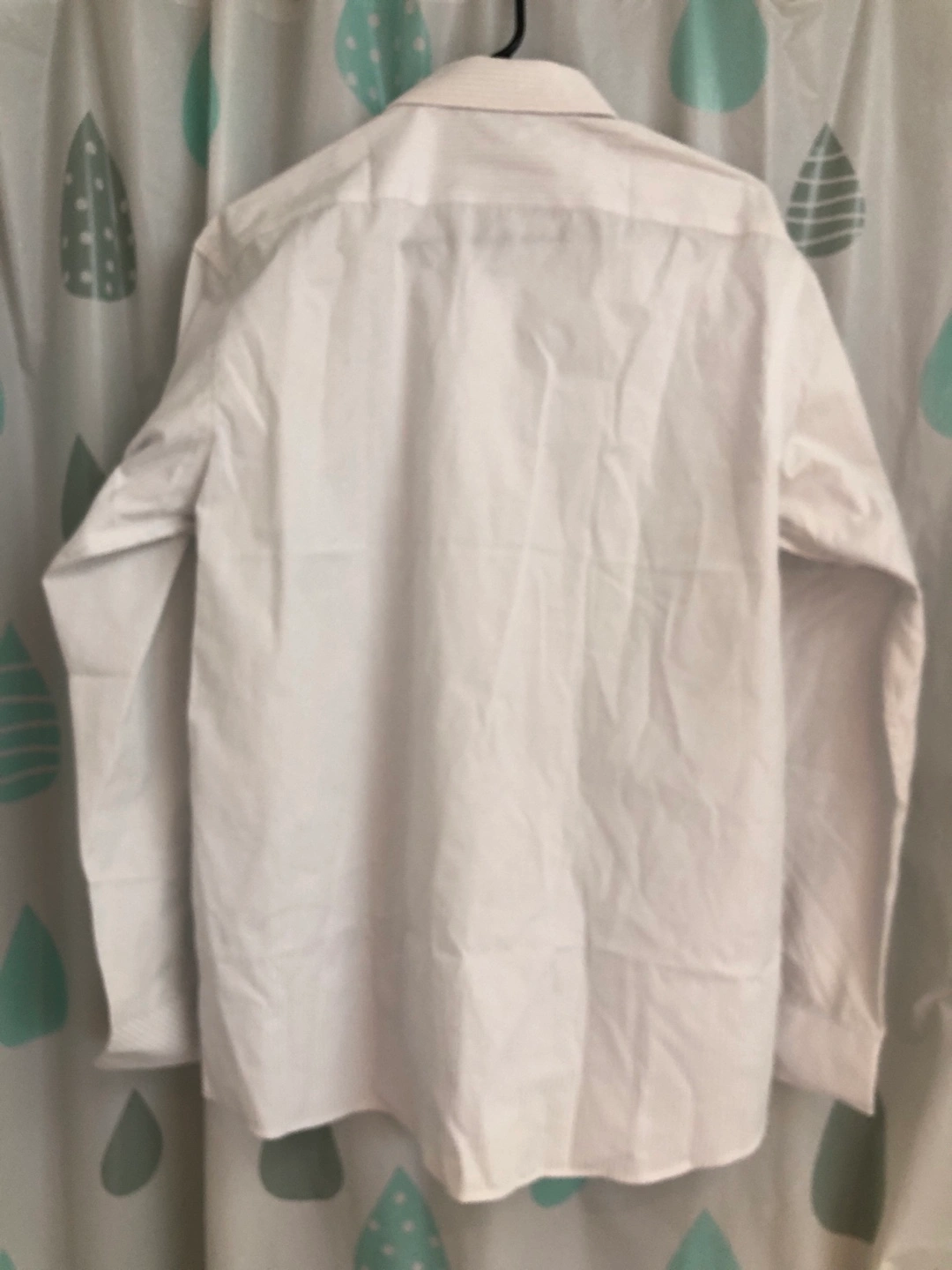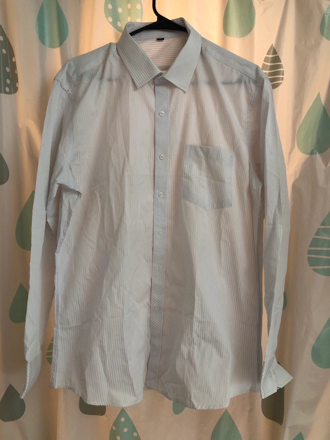 Long-sleeved button-down shirt. Light blue with thin, vertical stripes. Features a chest pocket. Classic collar and cuffs. Free shipping: If you spend more than 20 dollars in my list, you can get free shipping ( only in the old Toronto) Downtown pick up Cash only