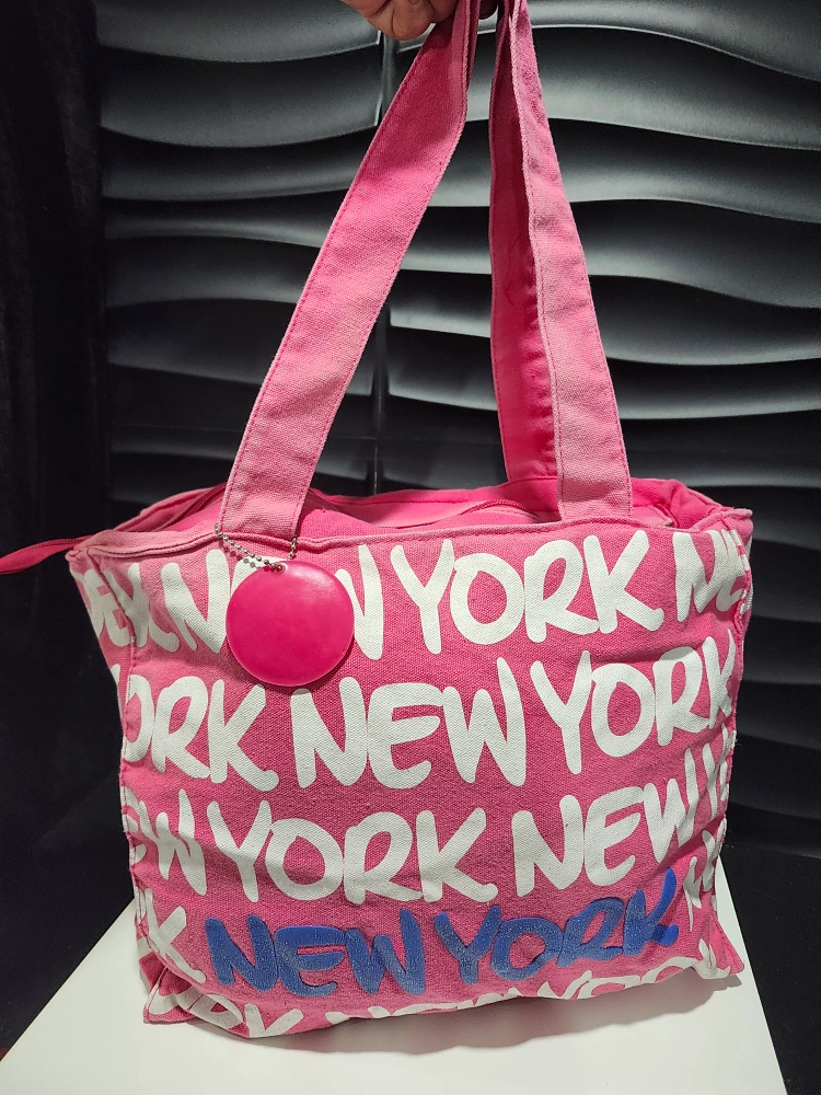 Large pink canvas tote bag. Features a graffiti-style New York City print in white and blue. Two top handles. Zipper closure. Brand tag included.