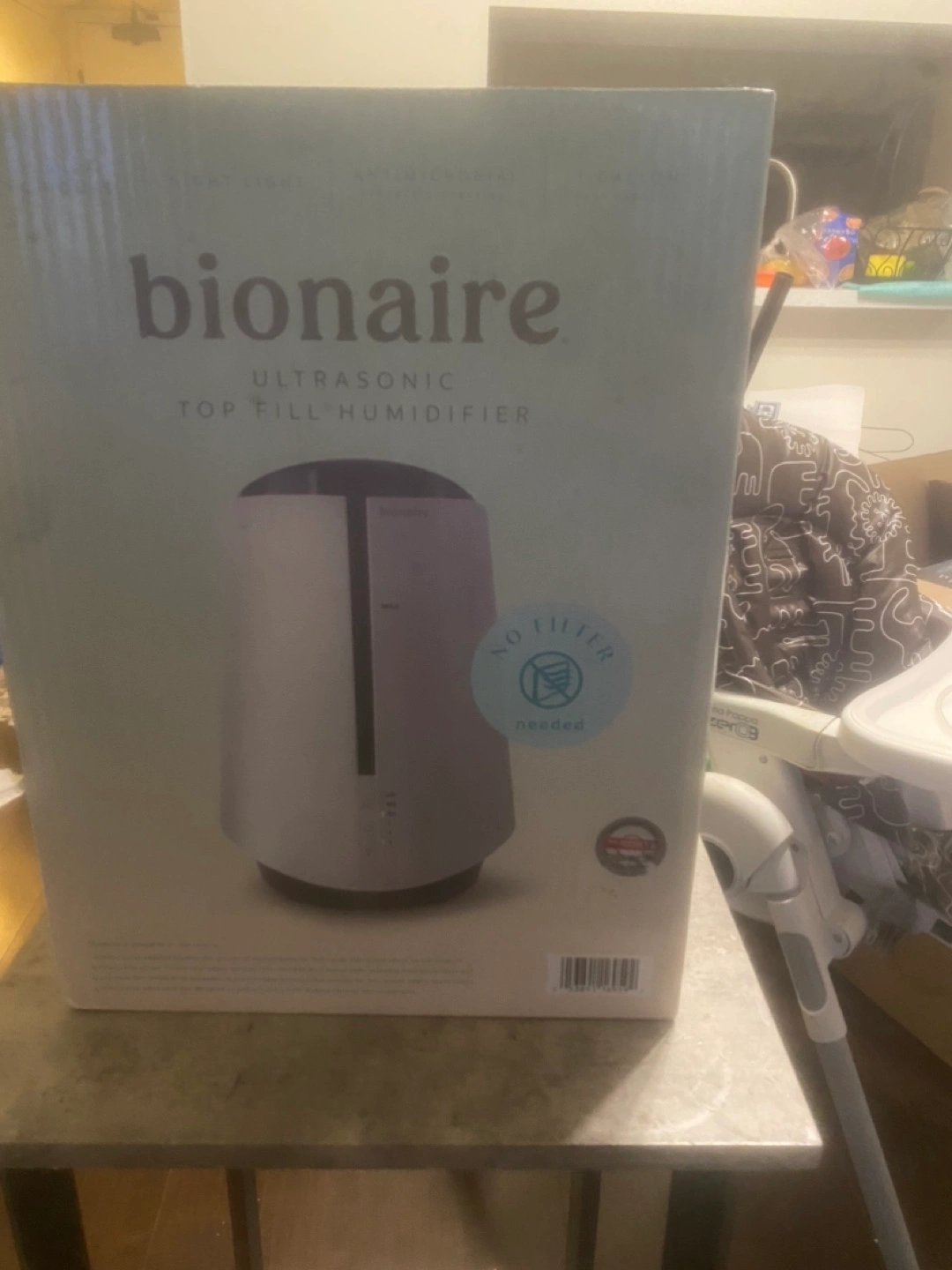 Brand new, unopened Bionaire ultrasonic top fill humidifier. No filter needed. Compact design, perfect for smaller rooms.