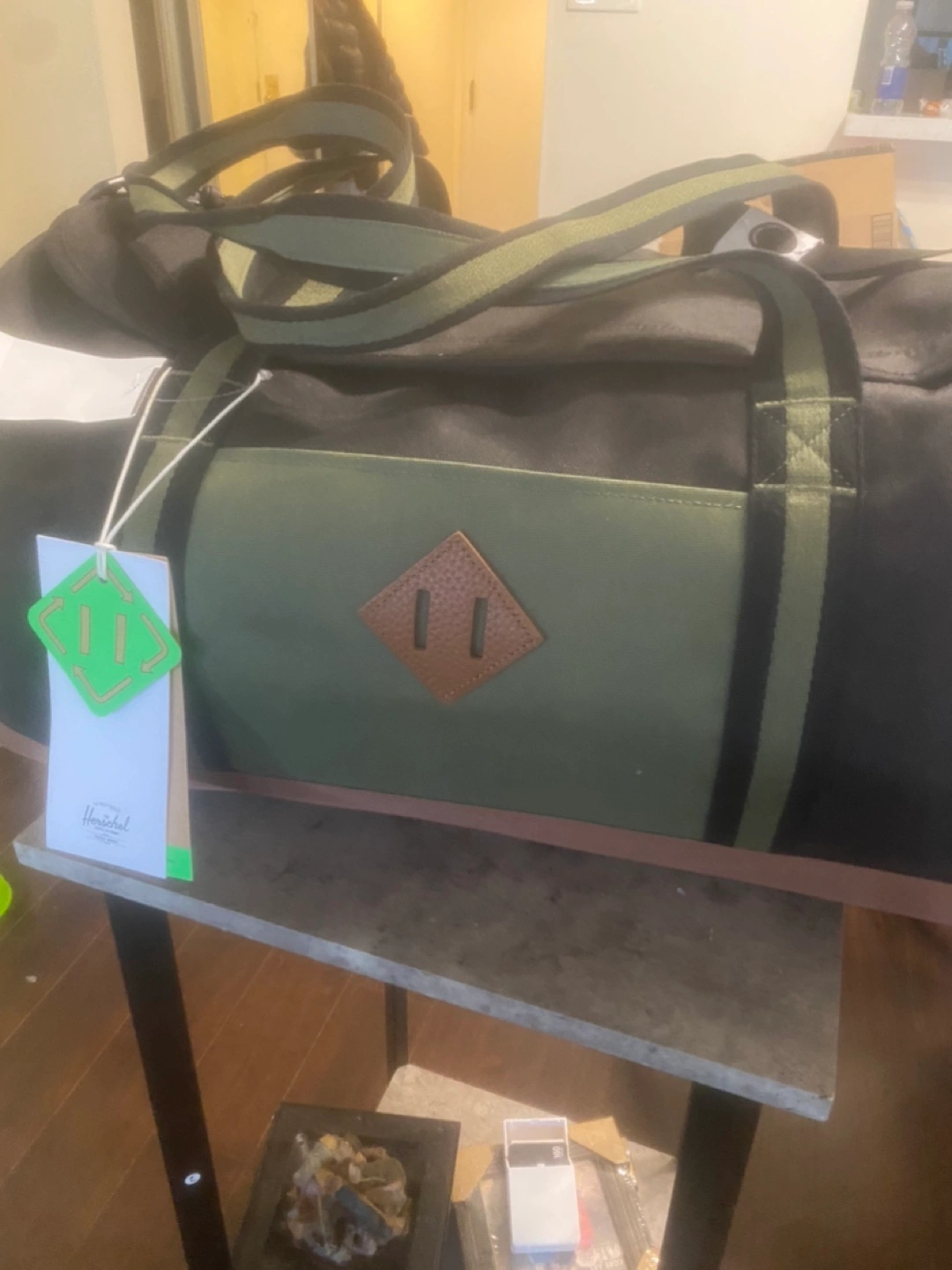 Olive green and black duffle bag. Features brown leather detailing. Shoulder straps included.