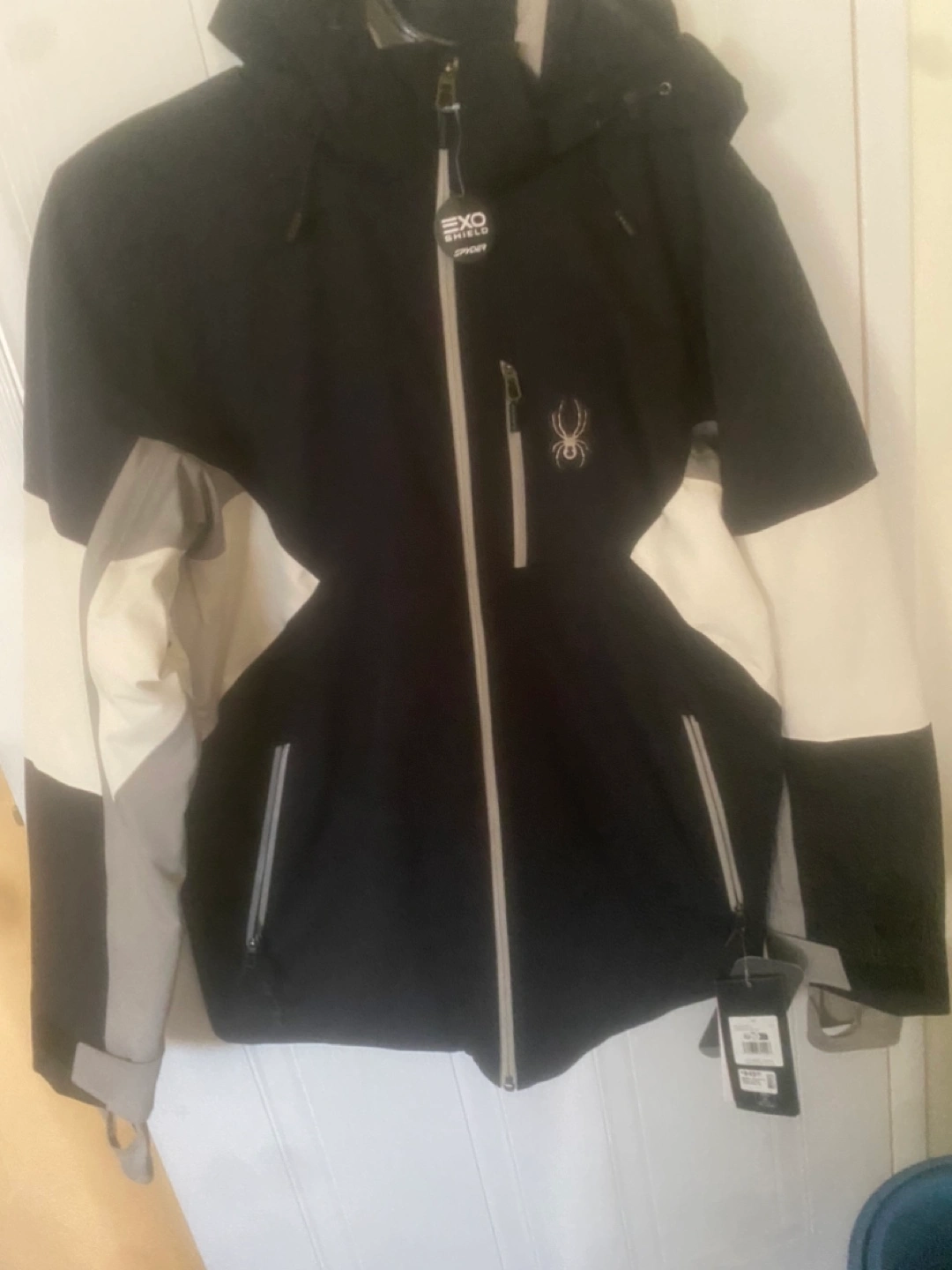 Men's Spyder ski jacket. Black, grey, and white colourblock design. Features a zip closure, zippered pockets, and a hood. ExoShield technology.