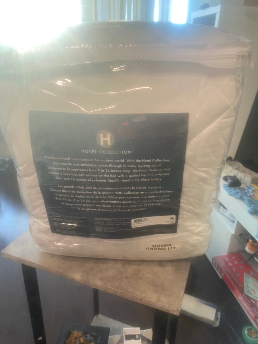 Queen size mattress pad. Designed to fit mattresses 7-24 inches deep. Features a quilted top and polyester skirt. Filled with 16 ounces of polyester fibrefill.