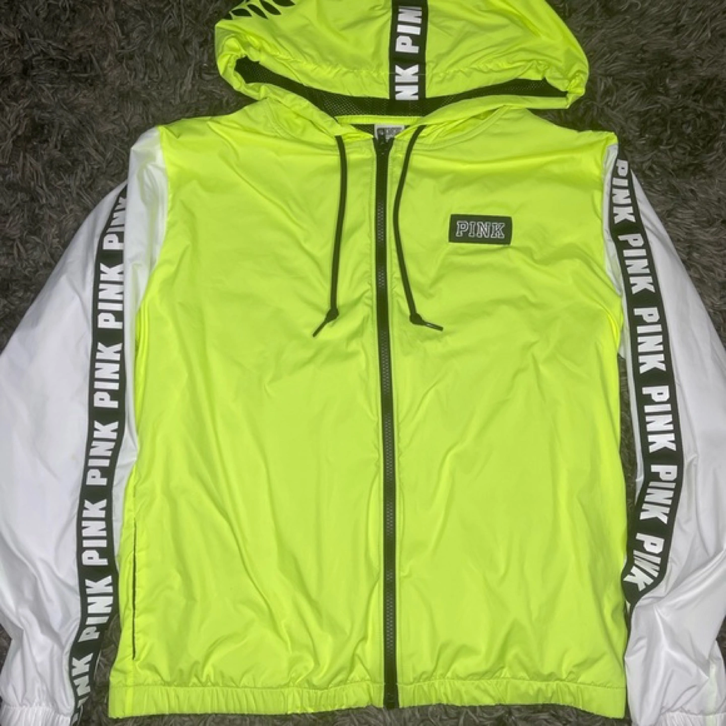 Pink by Victoria Secret Lightweight zip-up jacket. Features a neon yellow body, white sleeves with repeated PINK branding, and a black zipper. Size XS. Has a hood. Fits oversized