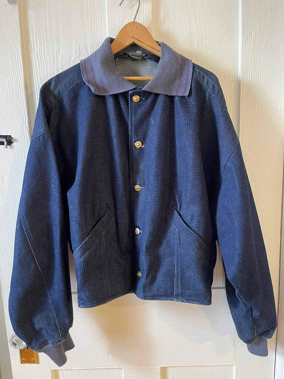 Vintage Versace Jeans Couture denim jacket. Size large on tag but fits Medium better, possibly a baggy look for a Small. Features a ribbed collar and cuffs. Button closure. Dark wash denim with a subtle woven pattern. Two pockets. Comfy and casual.