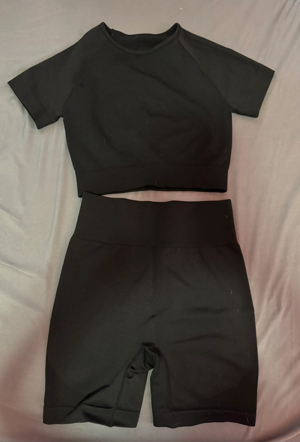 Workout set. Black seamless crop top and biker shorts. Short sleeves. High-waisted shorts.