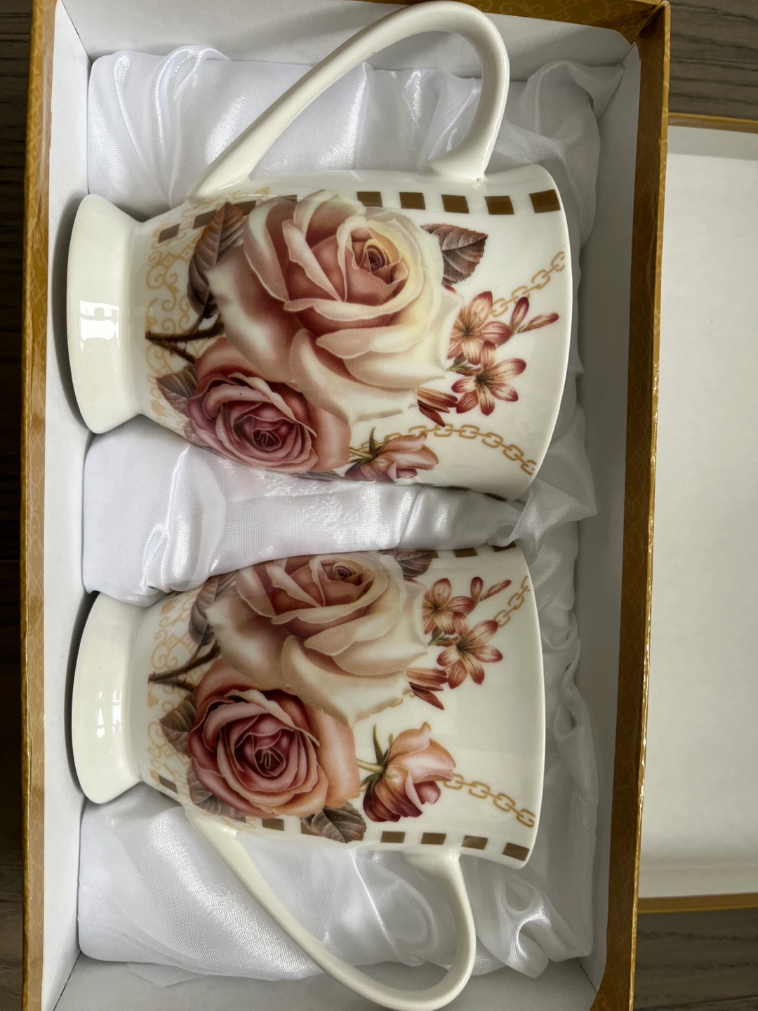 Pair of teacups, gold accents, floral print. Comes in a decorative box. Perfect gift Pick up only - Keele and Eglinton Ave W area Pet and smoke free home