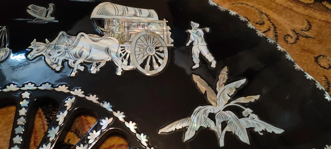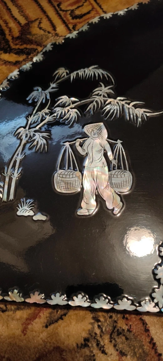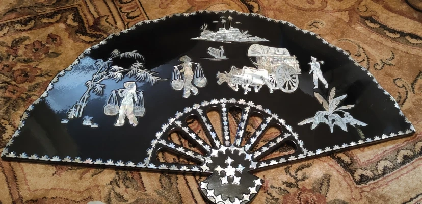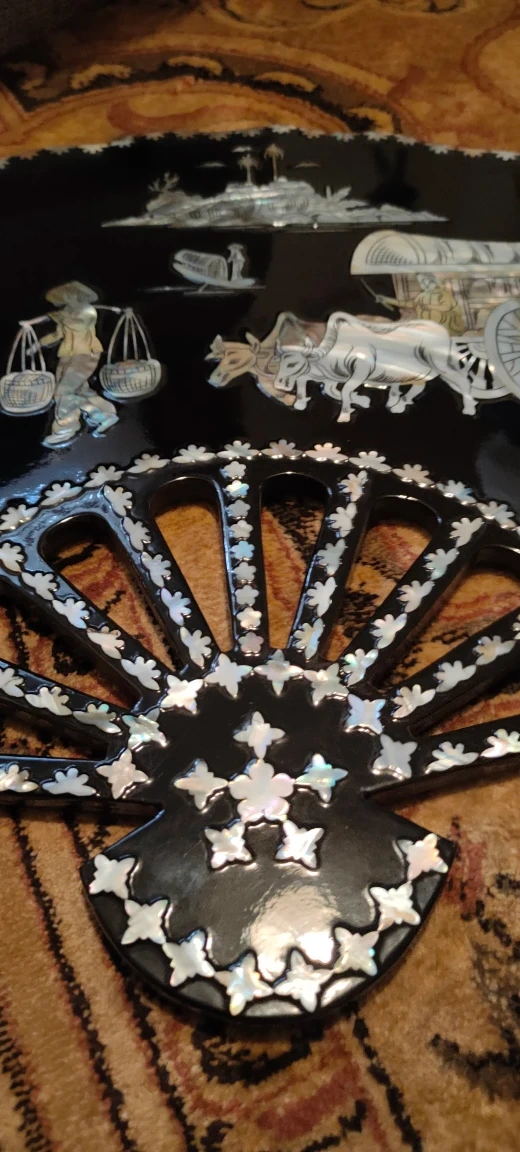Beautiful vintage wall decor. Features mother of pearl inlay. Intricate design. Black lacquer background. Unique piece. Size 24 * 14 " circa 1960-1970s