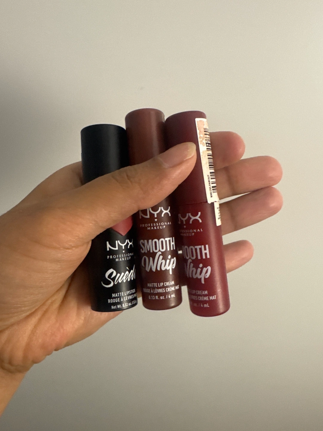 Three NYX Smooth Whip Matte Lip Creams. Shades include Suèd, and two others. I don’t remember using them