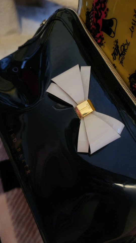 Glossy black patent cosmetic bag. Features a beige bow detail. Interior lining. (Water bottle for size) **Authentic**
