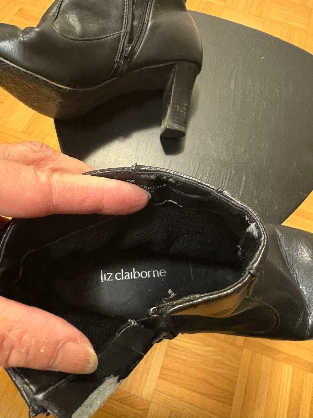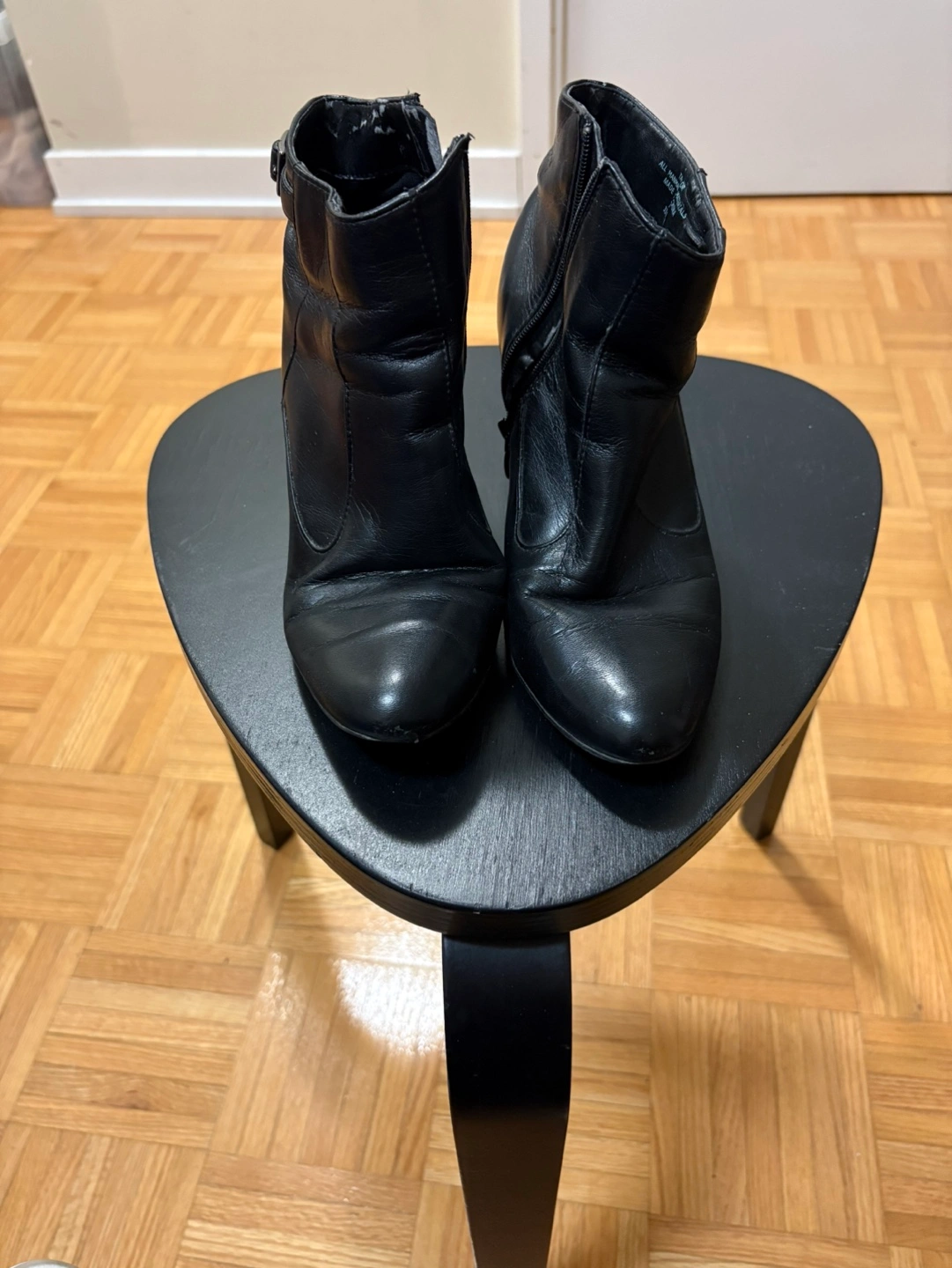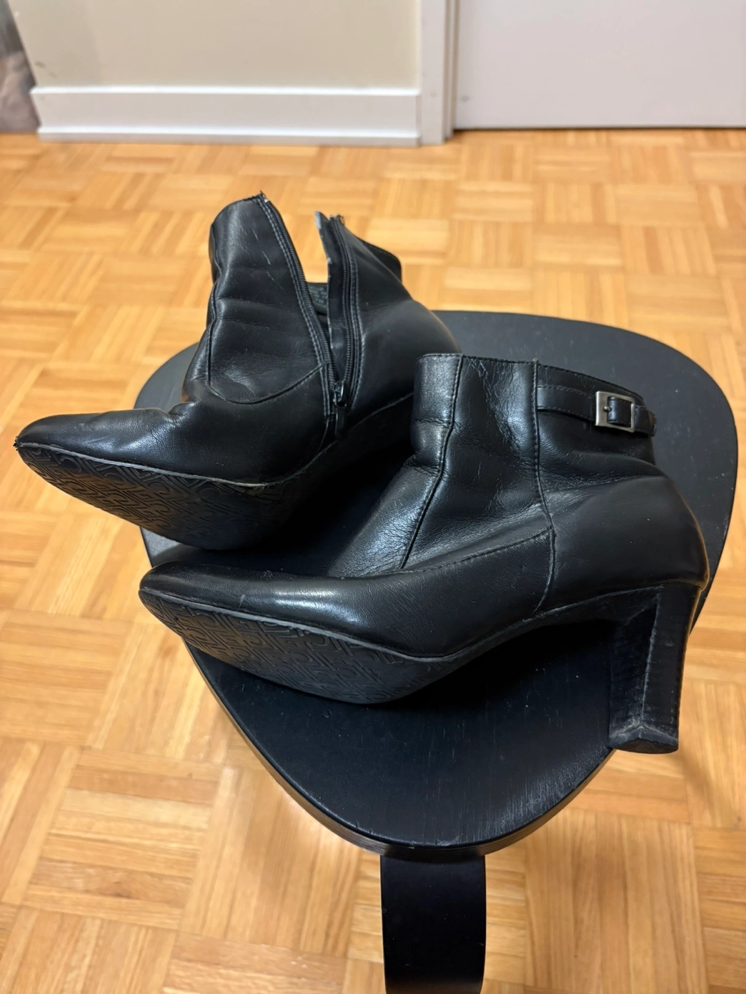 Women's black leather-like ankle boots. Side zipper and buckle detail. Low block heel. Pre-owned.