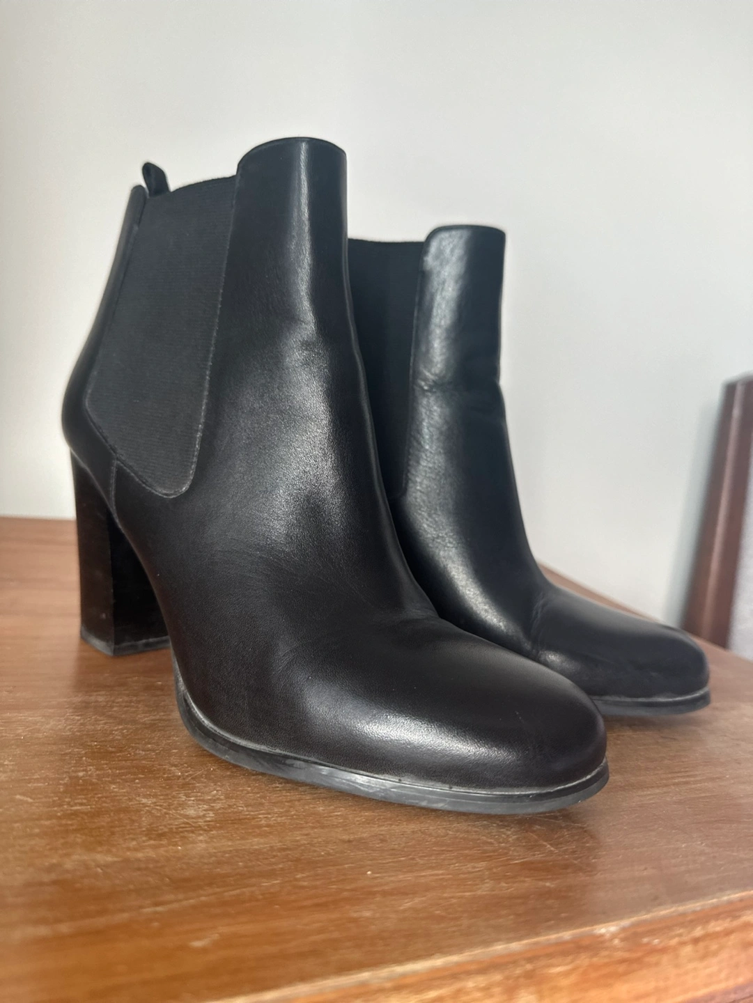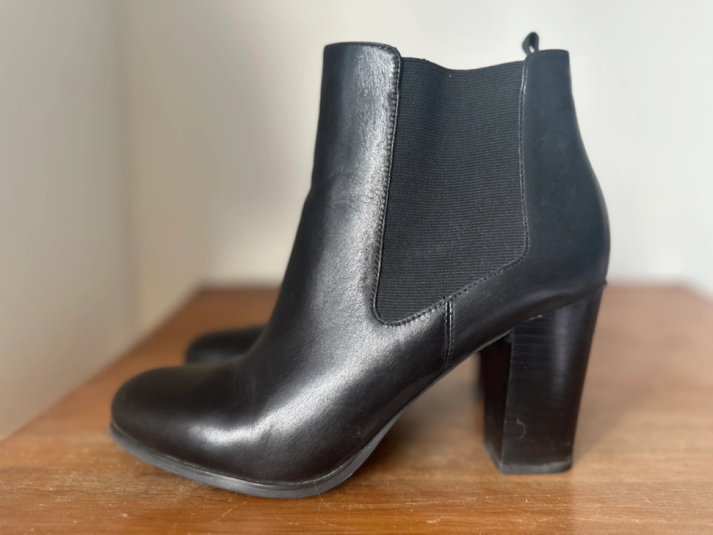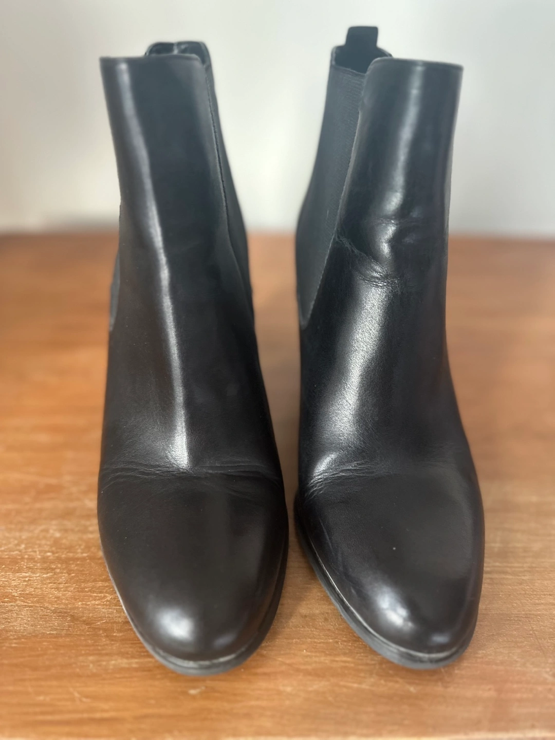 Women's black leather ankle boots. Block heel. Elastic side panels. Good condition. Size 9.5. Basically new. Worn maybe 3 times. Excellent condition. CASH ONLY please and thank you.