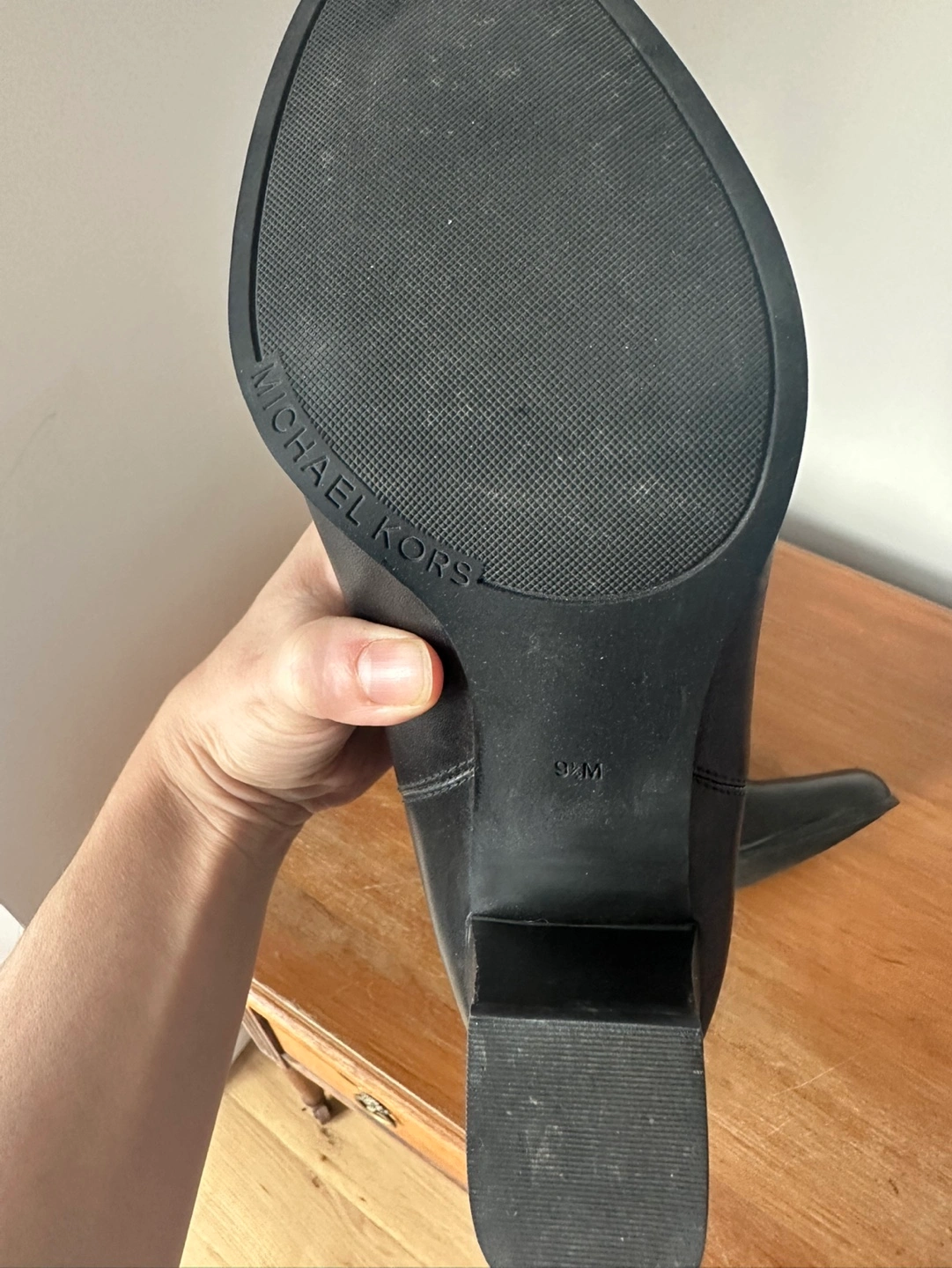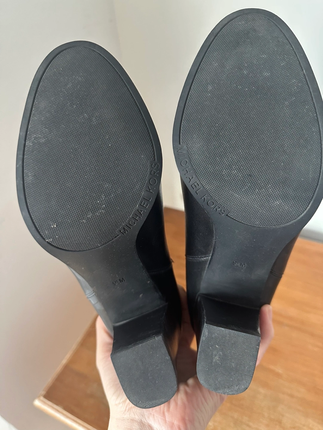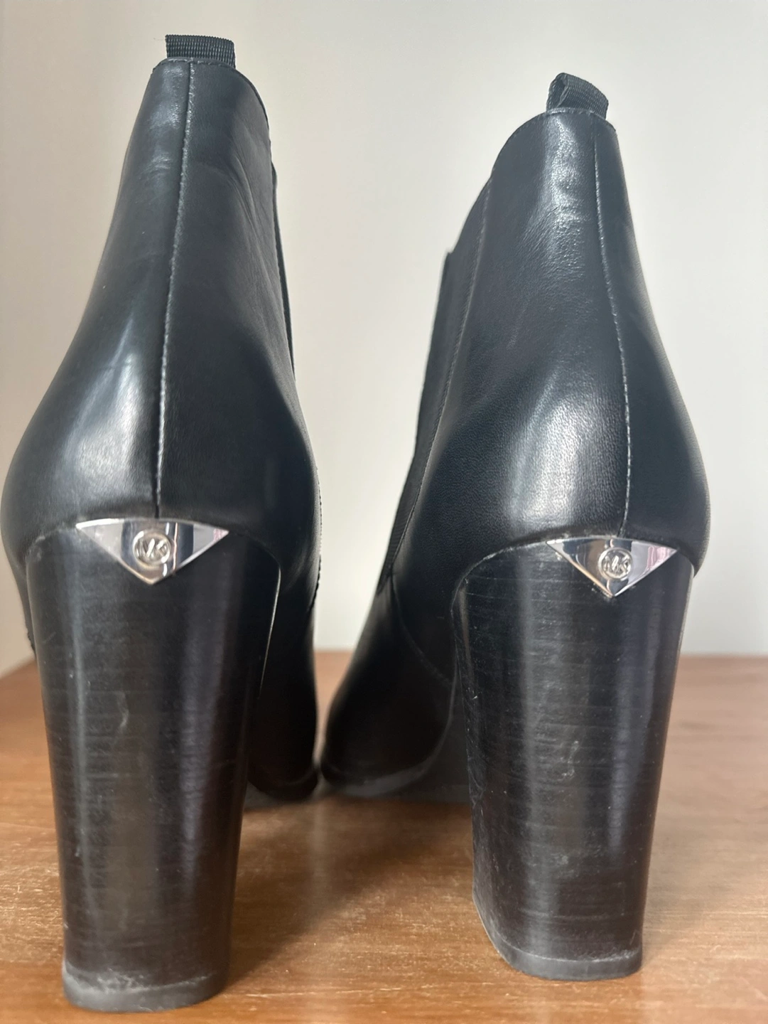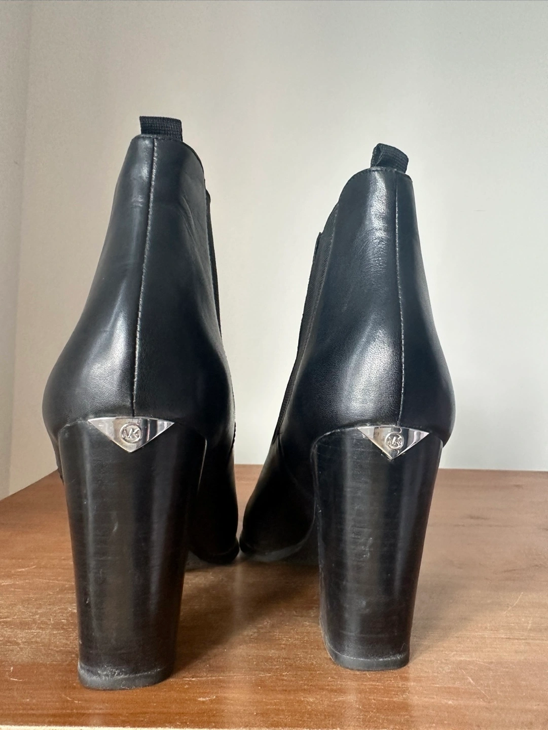 Women's black leather ankle boots. Block heel. Elastic side panels. Good condition. Size 9.5. Basically new. Worn maybe 3 times. Excellent condition. CASH ONLY please and thank you.