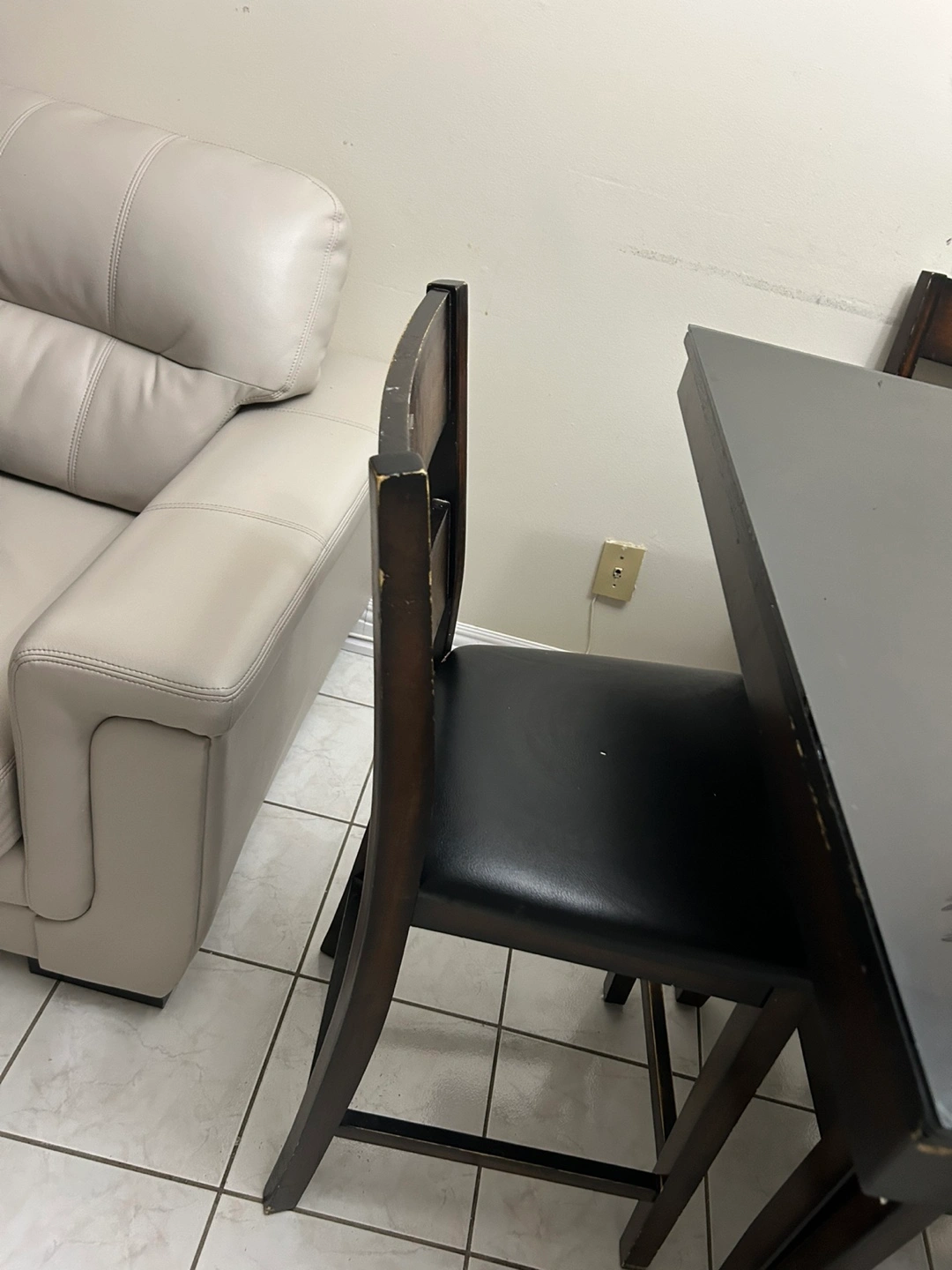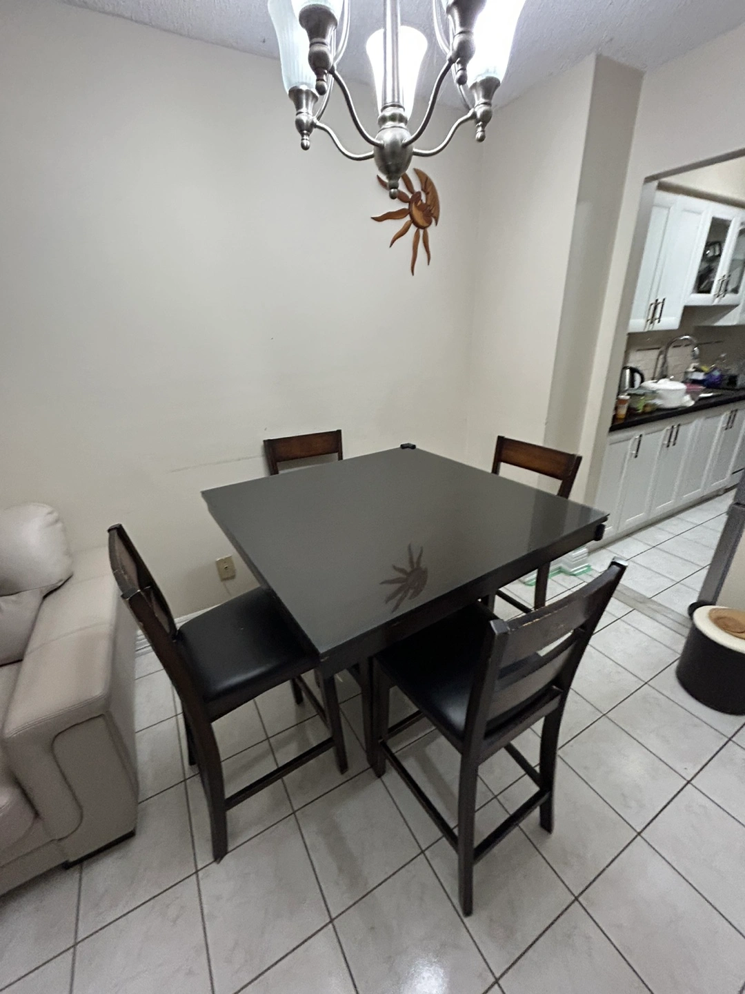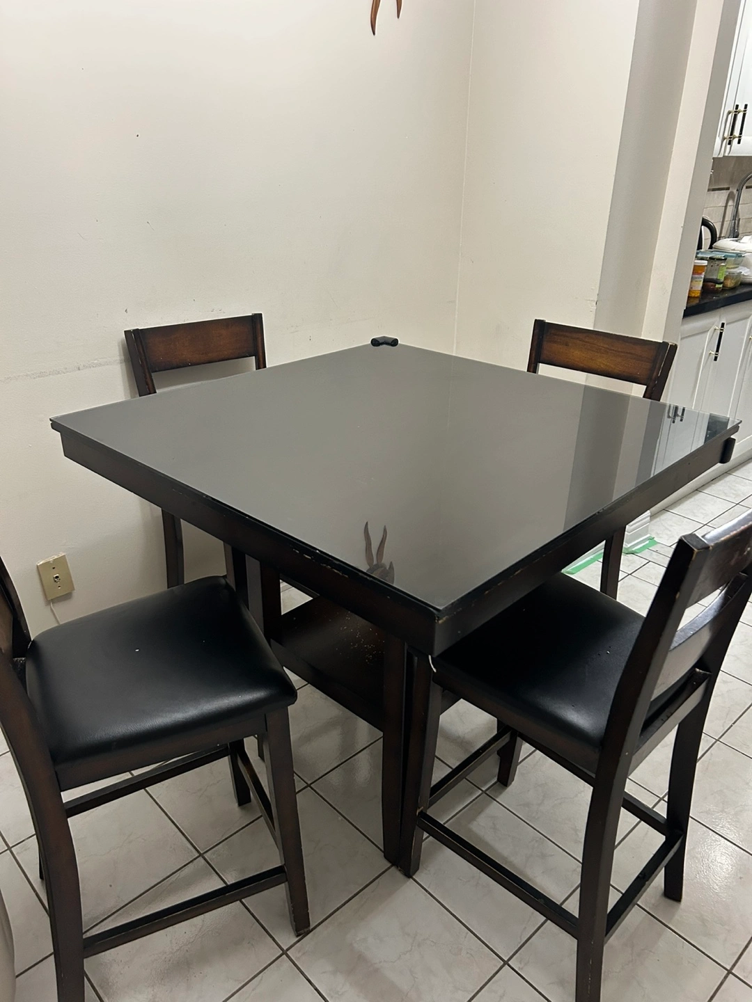 Square high dining table set. Four chairs included. Dark brown wood finish. Tabletop appears to be glass. Some minor wear and tear visible. Glass top included