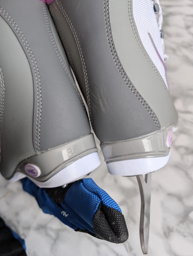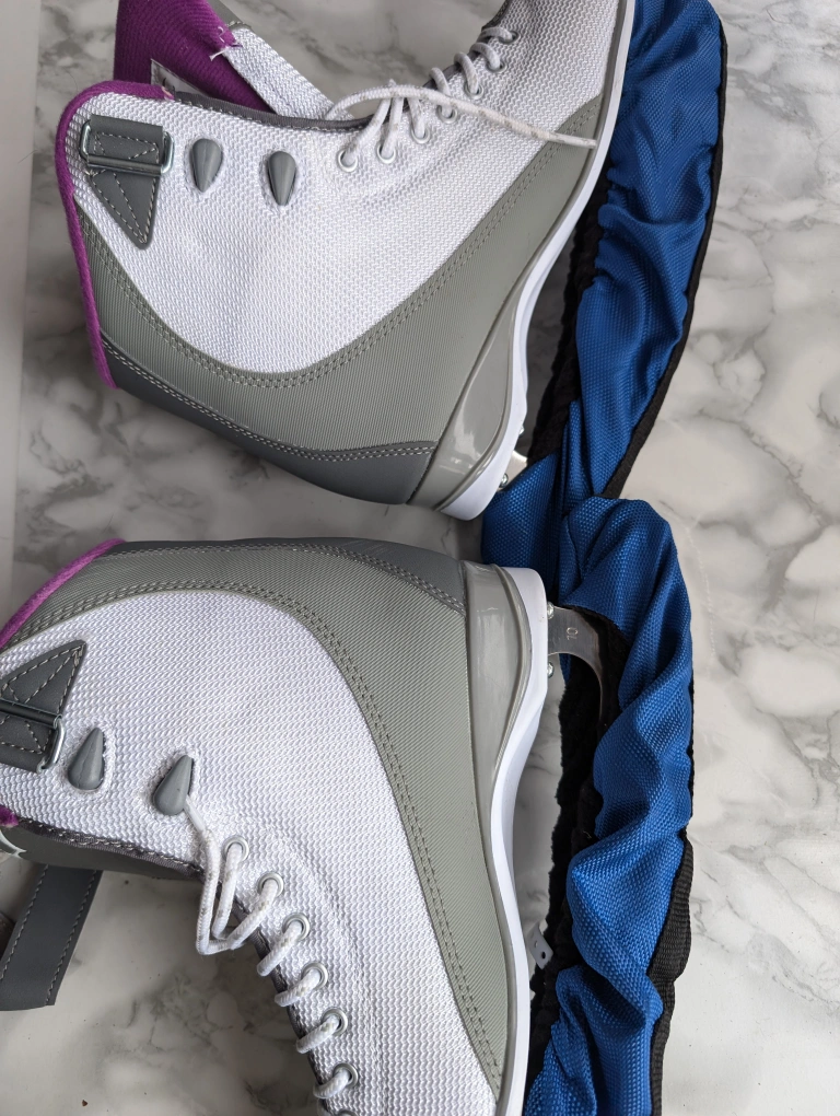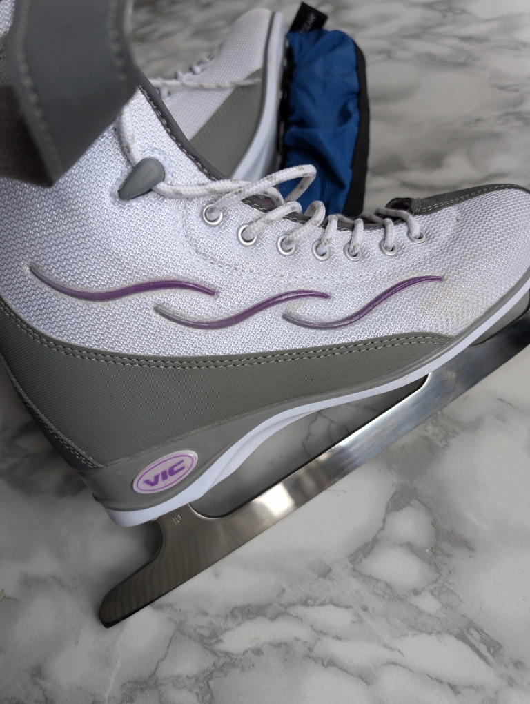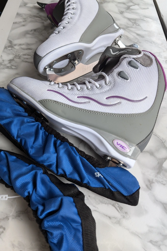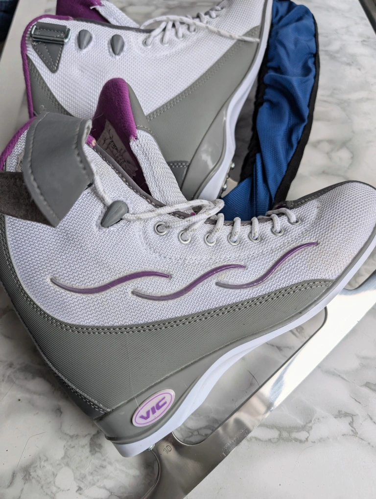 Women's figure skates. White and grey with purple accents. Includes blade guards and fleece covers. Very good used condition, hardly used, a couple of scuff marks Retail: $100, listing $50 Size 7, but fits big. I wear a size 8 1/2 and fits me snug with wool sock Can meet if not too far