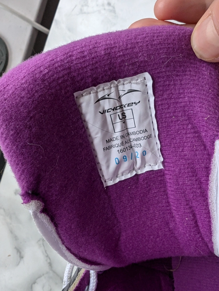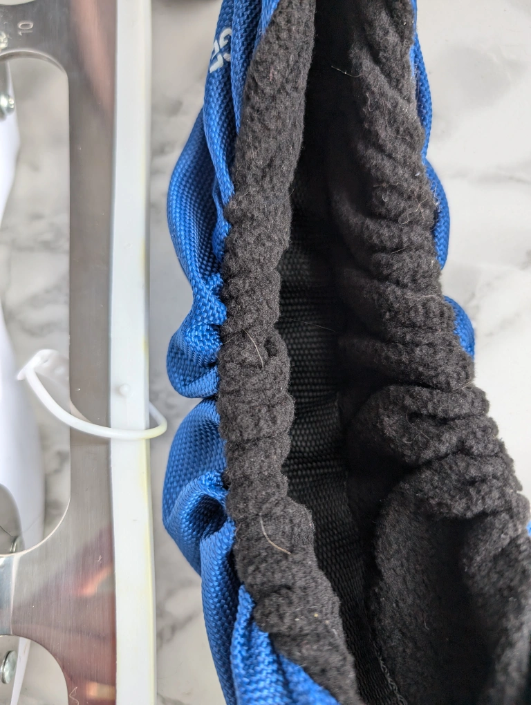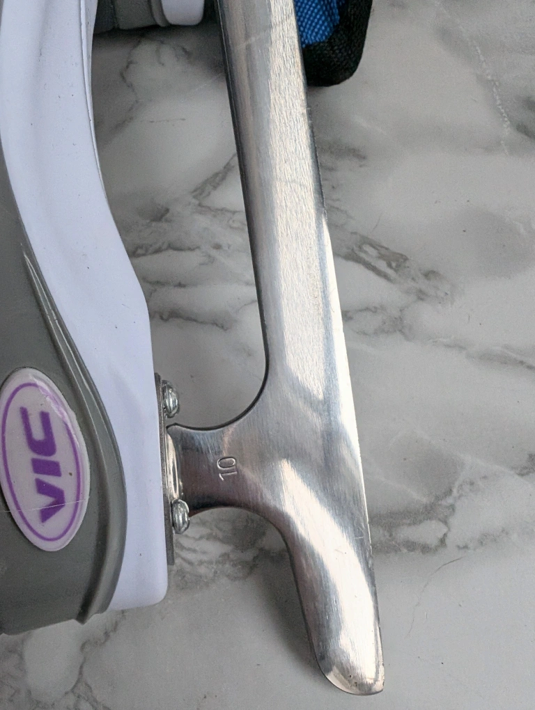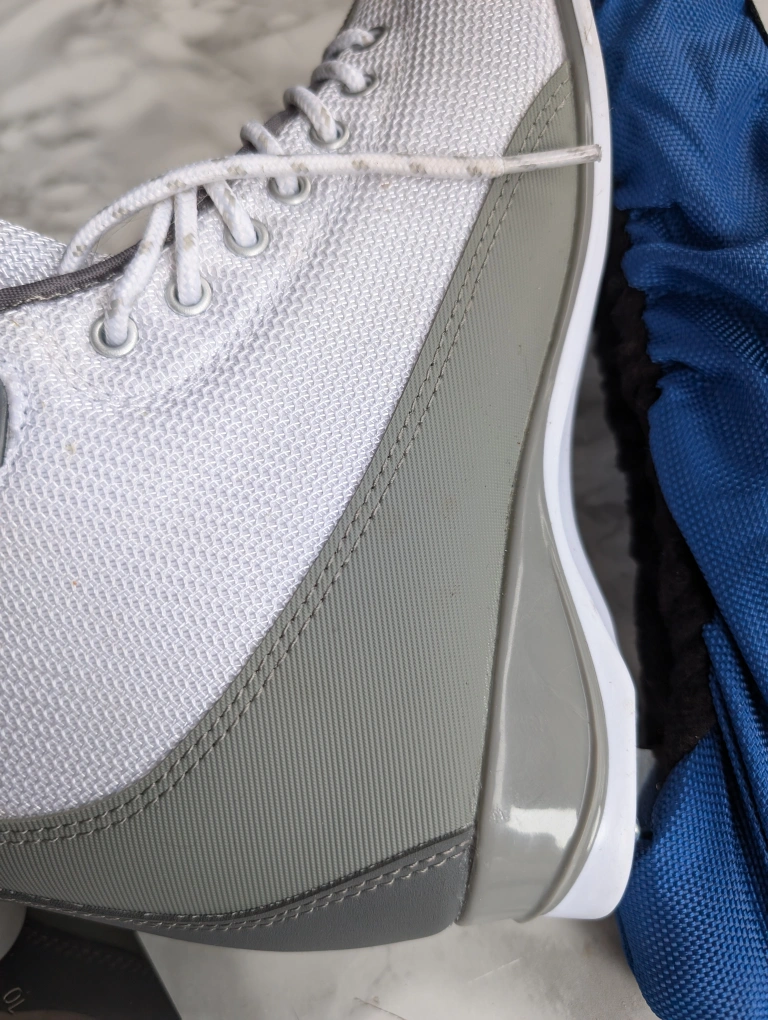 Women's figure skates. White and grey with purple accents. Includes blade guards and fleece covers. Very good used condition, hardly used, a couple of scuff marks Retail: $100, listing $50 Size 7, but fits big. I wear a size 8 1/2 and fits me snug with wool sock Can meet if not too far