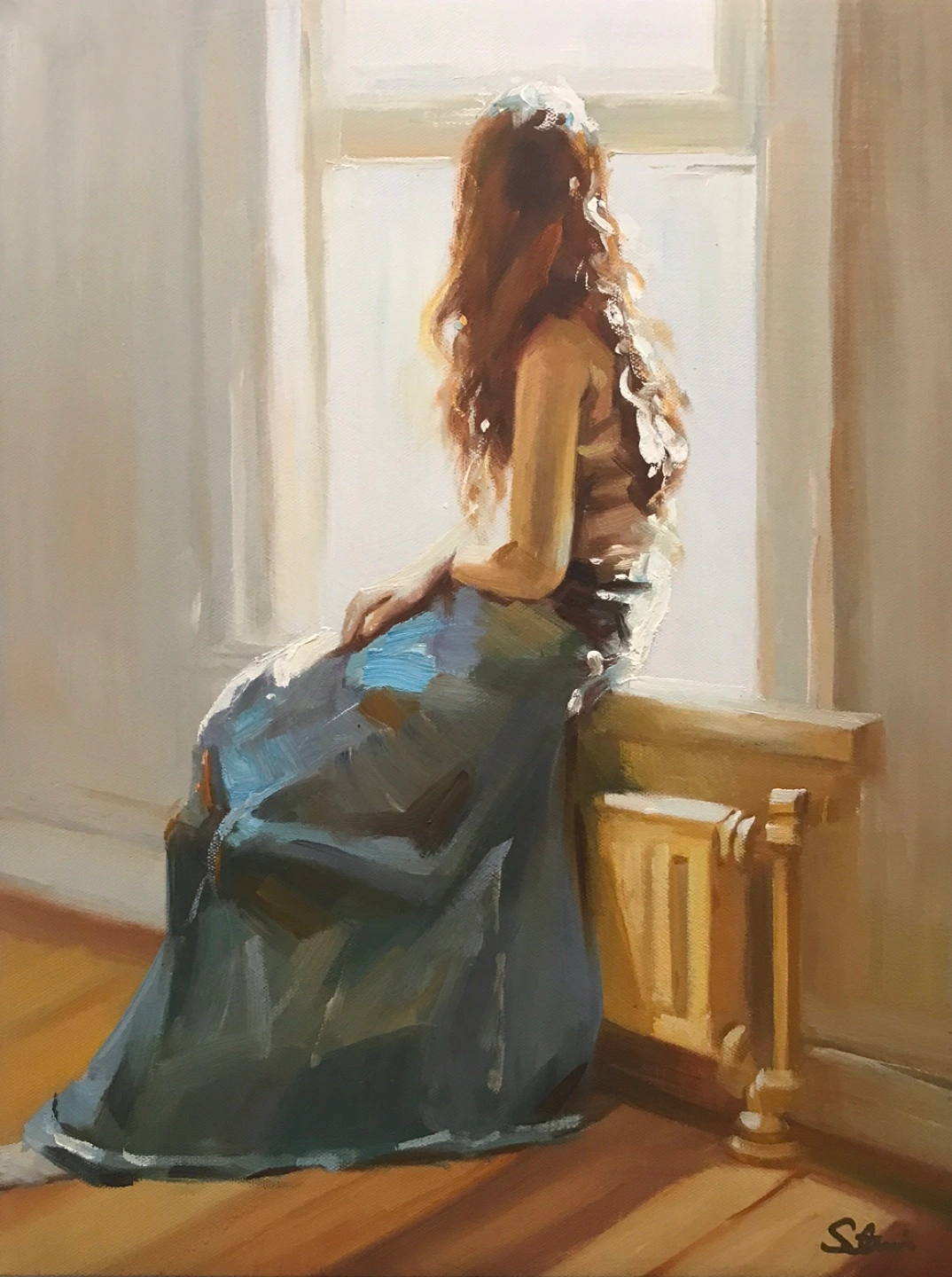 Beautiful oil painting on canvas. Depicts a woman sitting by a window in a long dress. Lovely colours and brushstrokes. Signed by the artist.