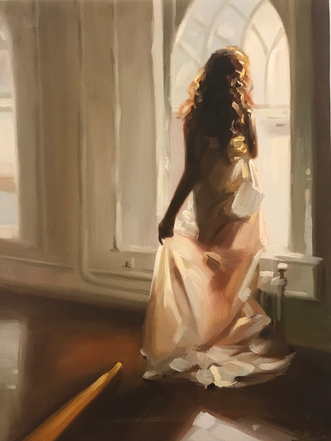 Beautiful original oil painting. Depicts a woman in a flowing dress standing at a window. Warm colours and soft brushstrokes. Great piece for home decor.