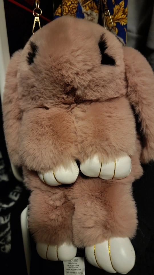 Cute bunny-shaped bag. Soft pink fur. Features a gold-toned chain strap (removable) and white accents on the paws. Brand New & unused