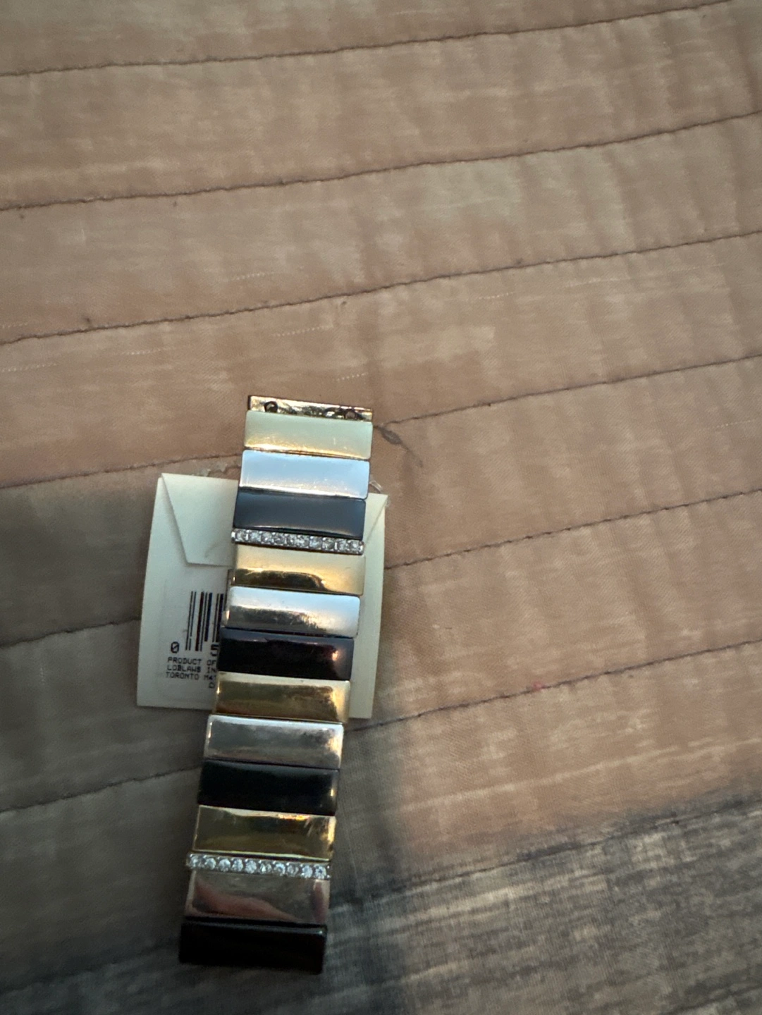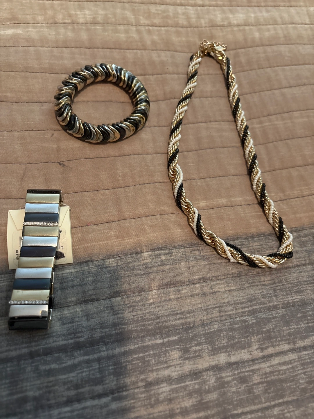 NEW Three-piece jewellery set. Includes a long beaded necklace and two different style bracelets. One bracelet is a flexible gold silver and black design, the other is rigid with gold silver and black rectangular elements. **Excellent for adding a touch of vintage glamour to your look…. Pick up on Chandos Drive Kitchener.
