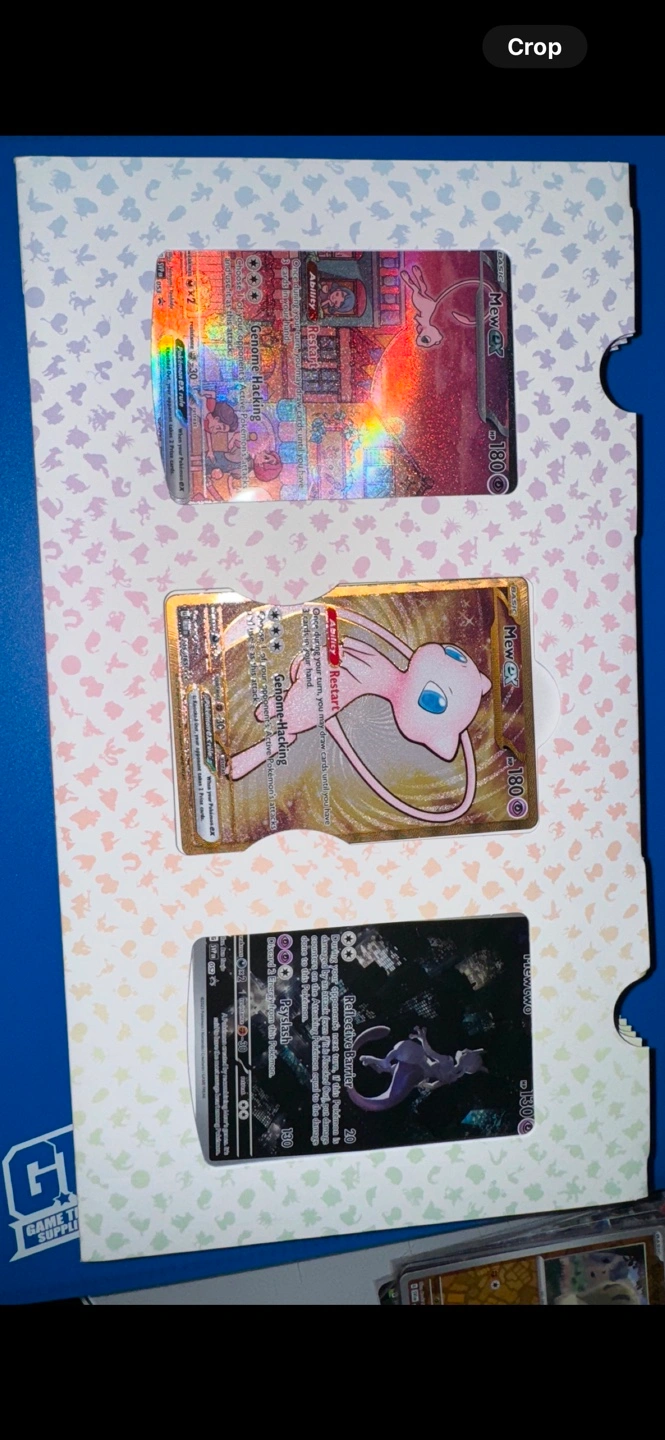 Three Pokémon trading cards. Mewtwo and Mew EX cards.