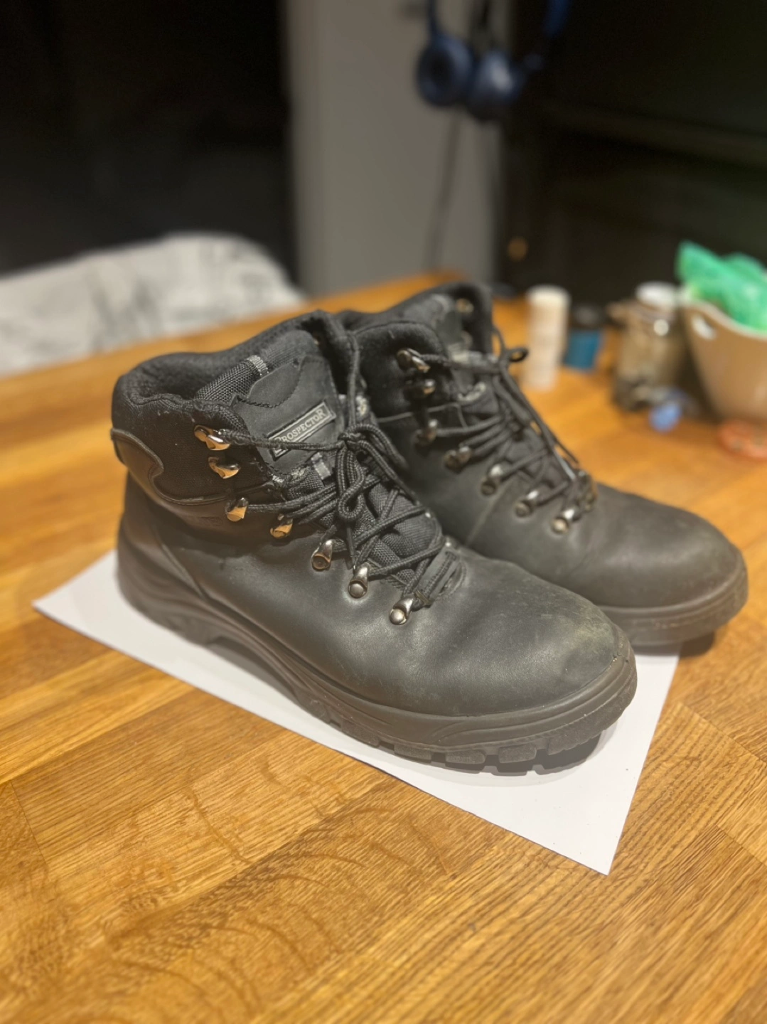 Pair of black leather Prospector boots. Lace-up style. Good for outdoor winter wear. Used condition.