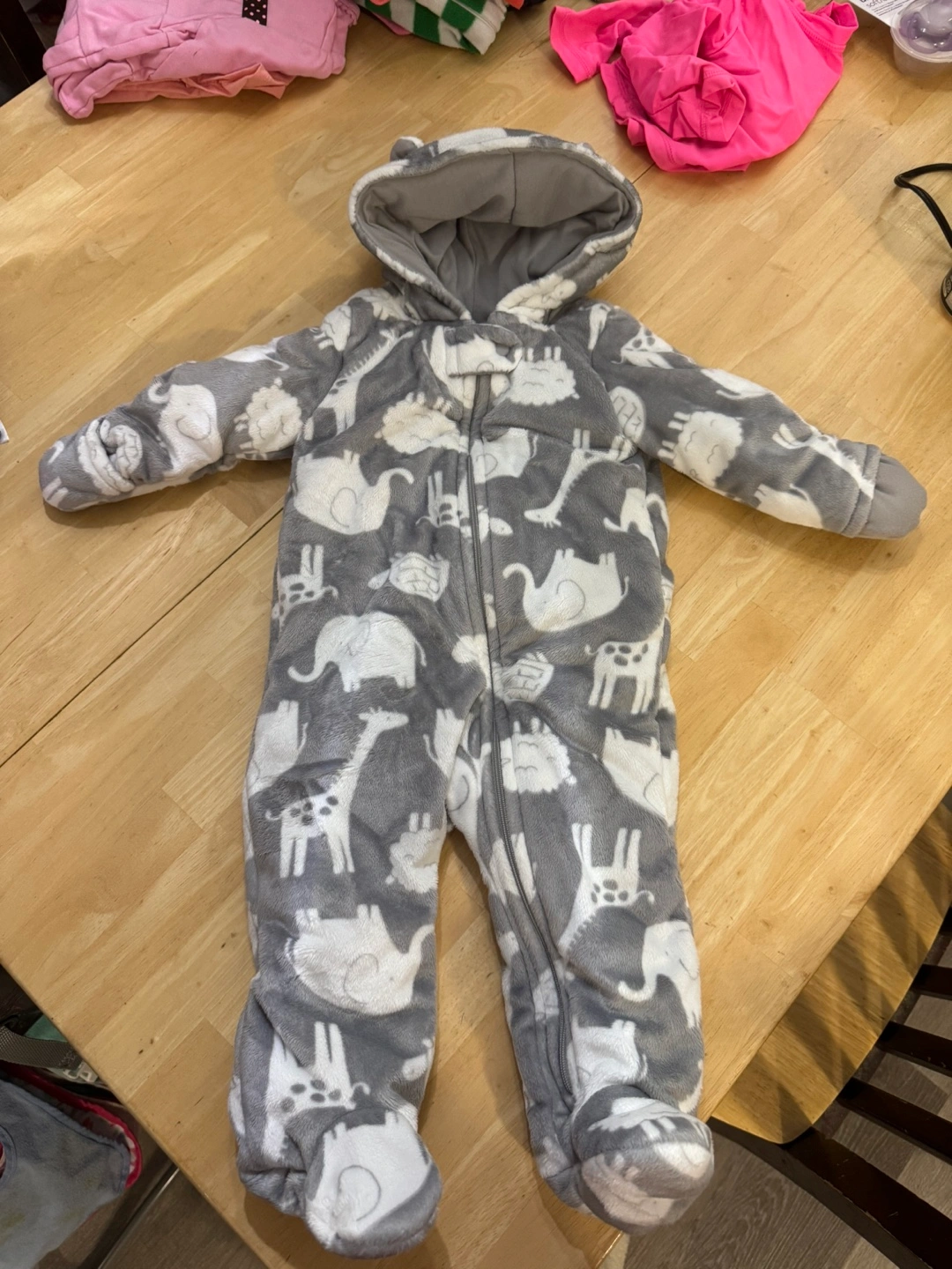 Adorable grey baby snowsuit. Features a plush material, animal print, and hooded design. Suitable for colder weather. Zip closure. Size 6-9 months.