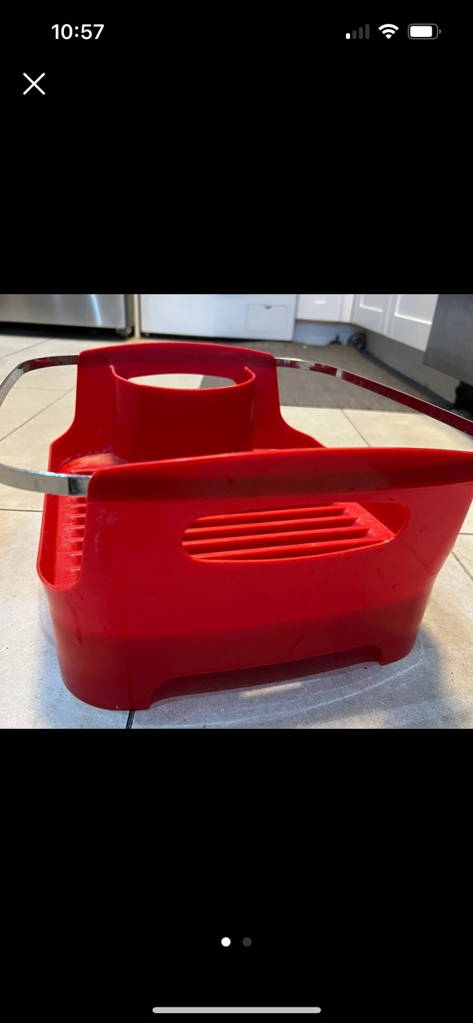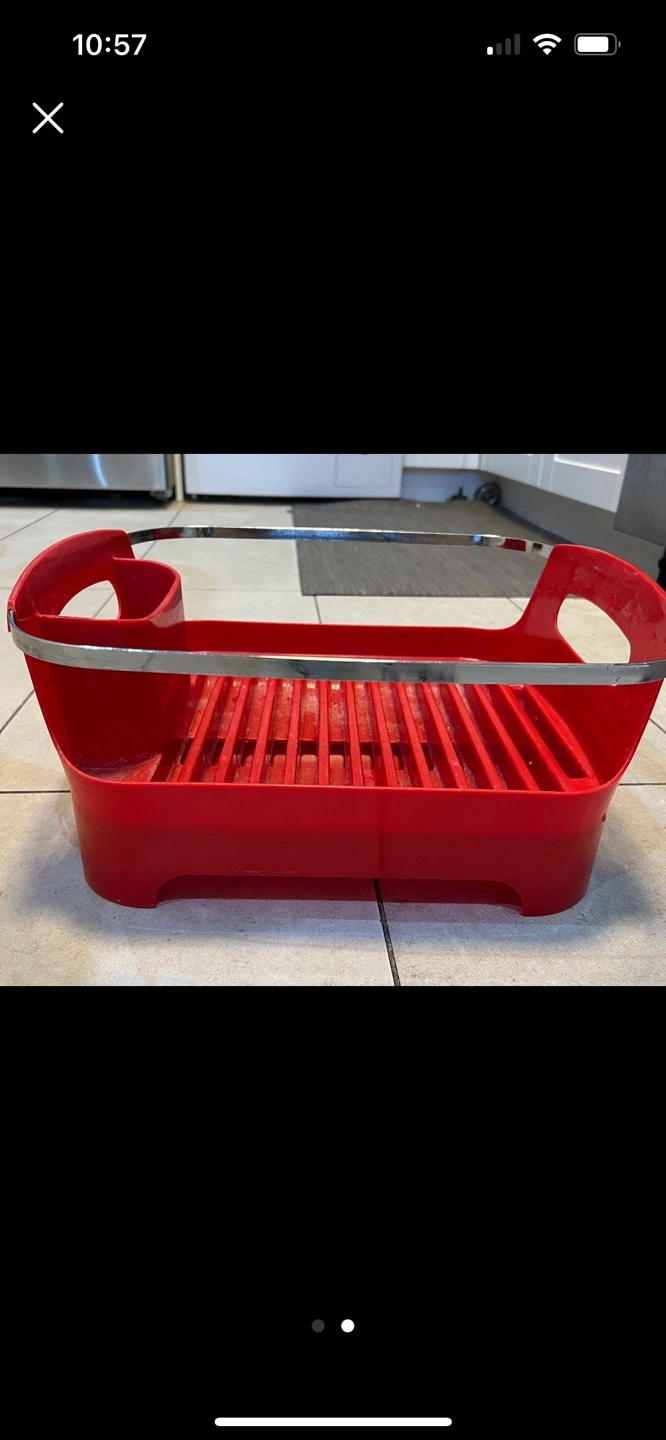 Compact dish rack. Red plastic construction. Chrome-plated metal accents. Cutlery holder included. Ideal for small kitchens or apartments.