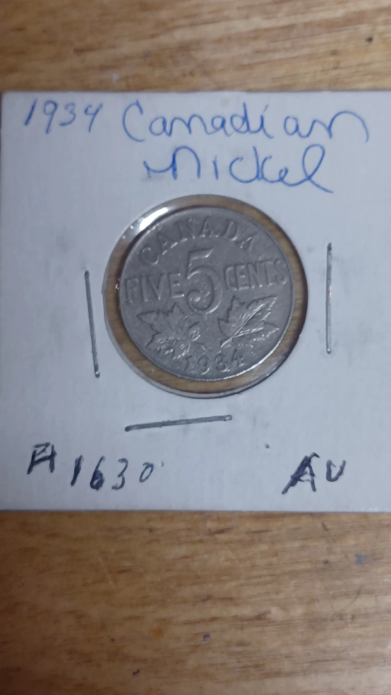 1934 Canadian five cent nickel. Coin in holder. Appears to be in good condition.