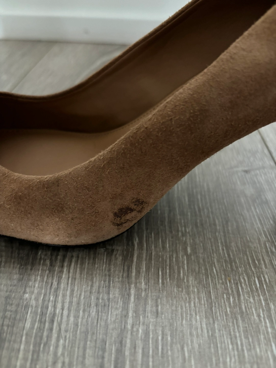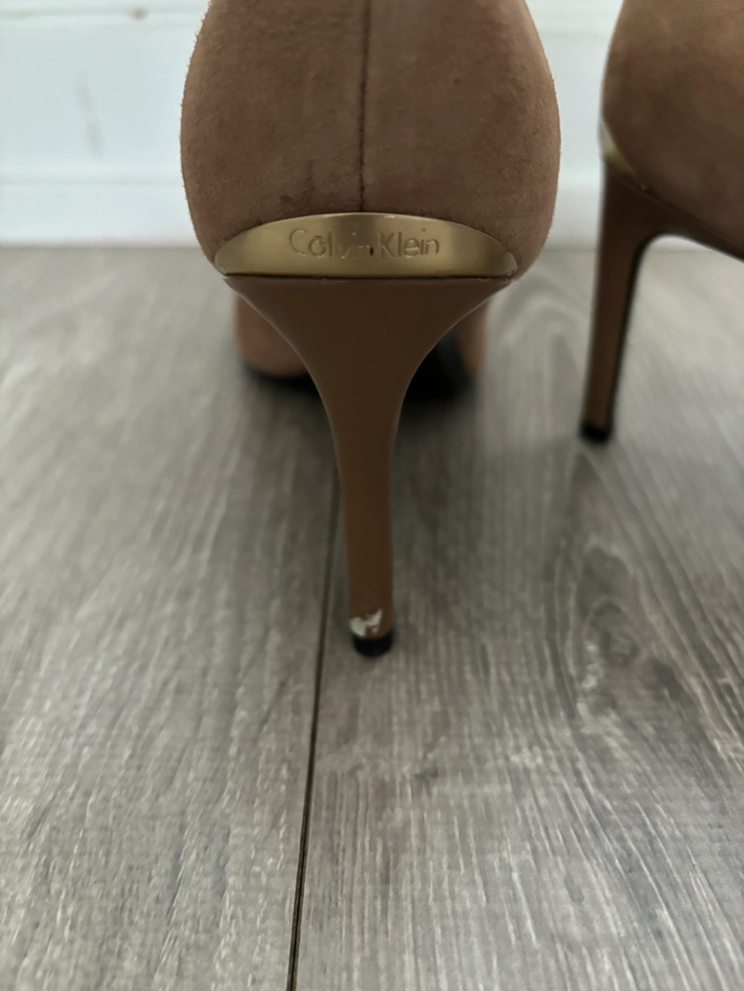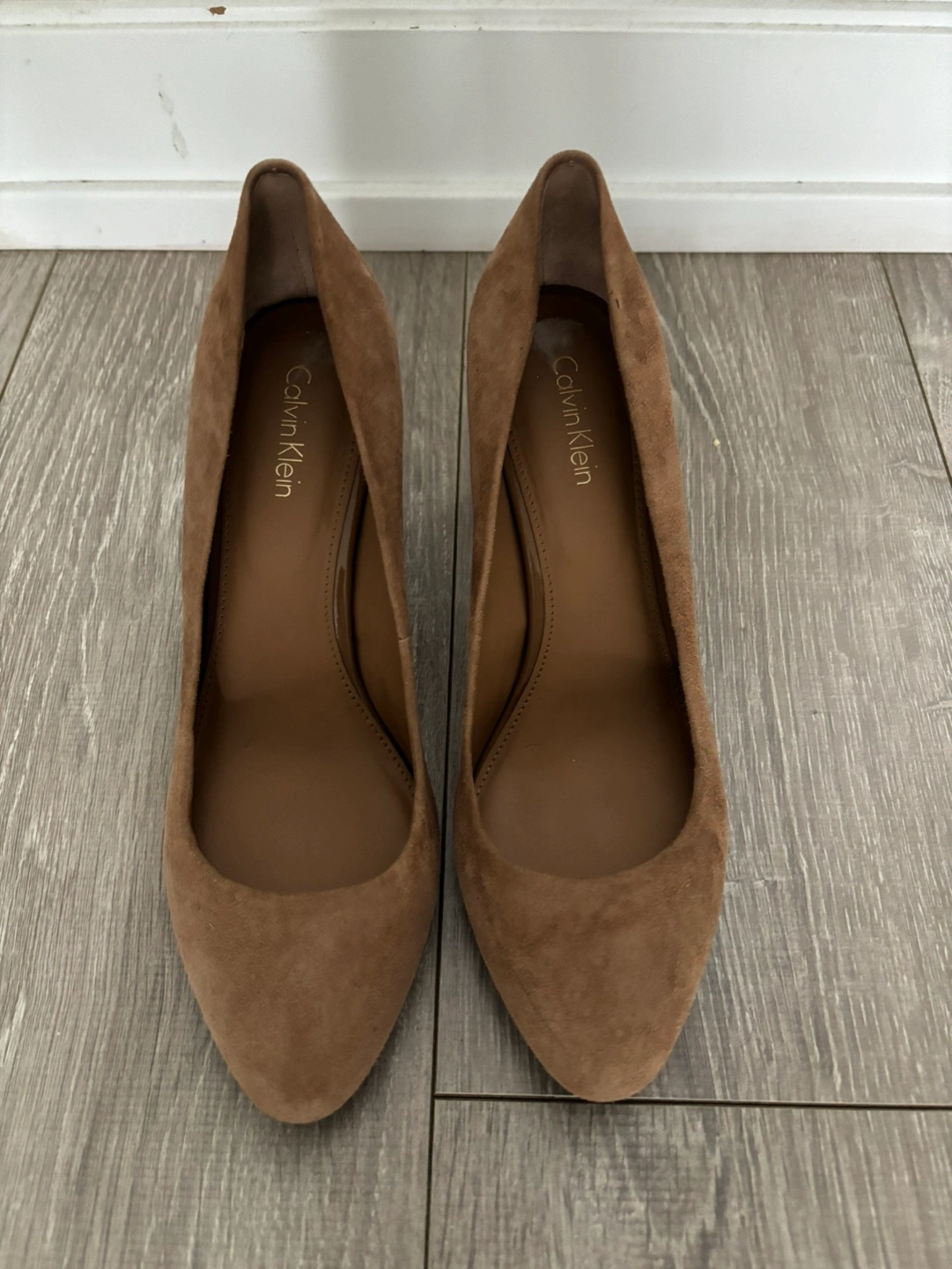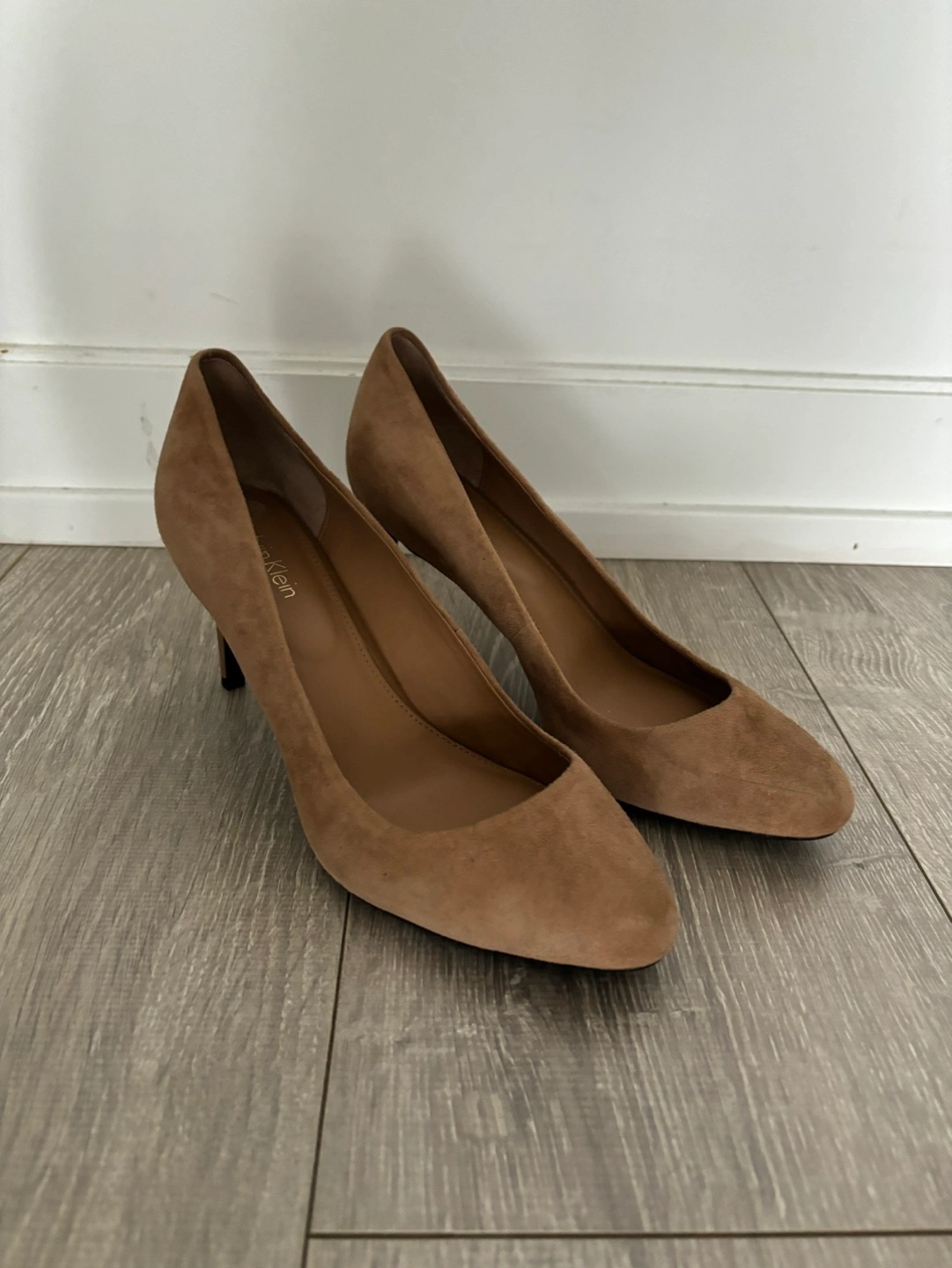 Brown Calvin Klein suede heels. Wore them just once. Slight scuff on one heel and black stain (maybe just dirt?) on one side. Cash only.