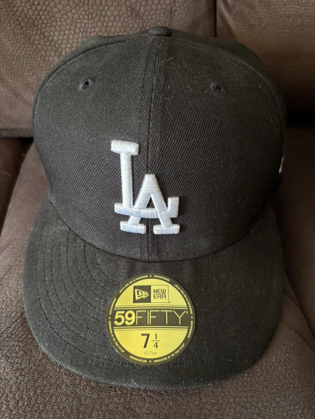 Black fitted baseball cap. Features the iconic LA logo in silver. Size 7 1/4.