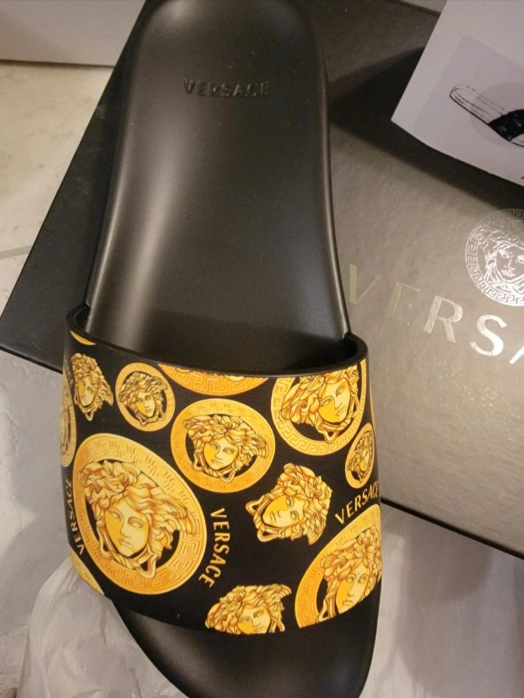 Men's Versace coin Pool Slides. Size 40. Black slides with gold Medusa head print. Made in Italy. **NWB** (New with box) included. Bought in the US at Saks. ***Authentic*** & never used..(bottom is a lil dusty as I didnt store them properly) in MINT condition Pick up location: Tim Hortons