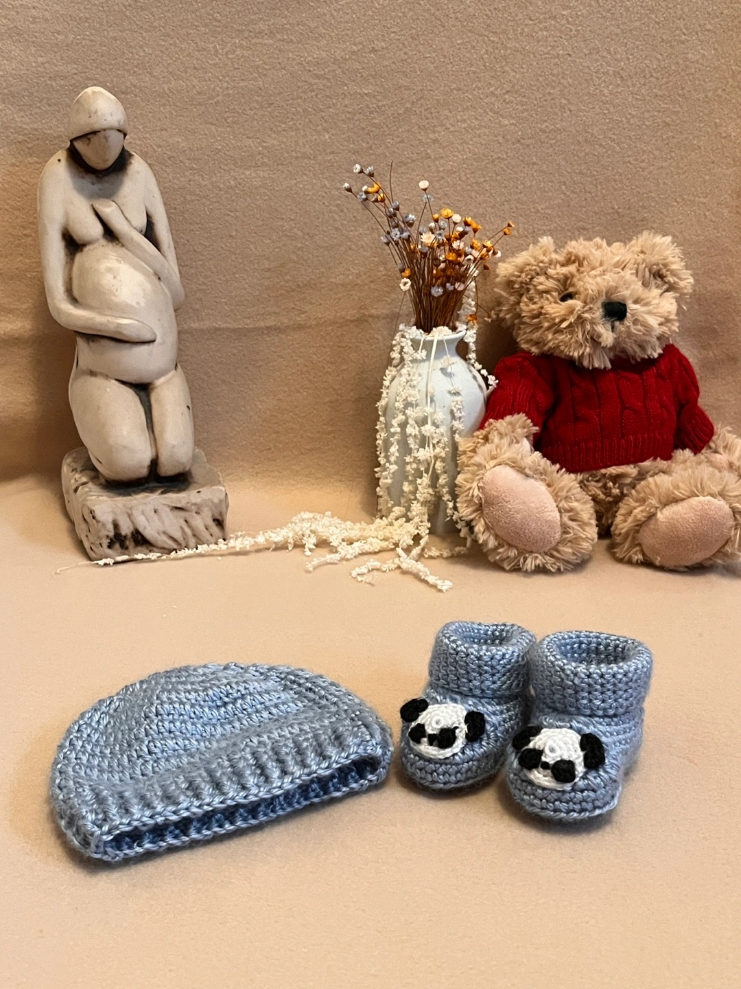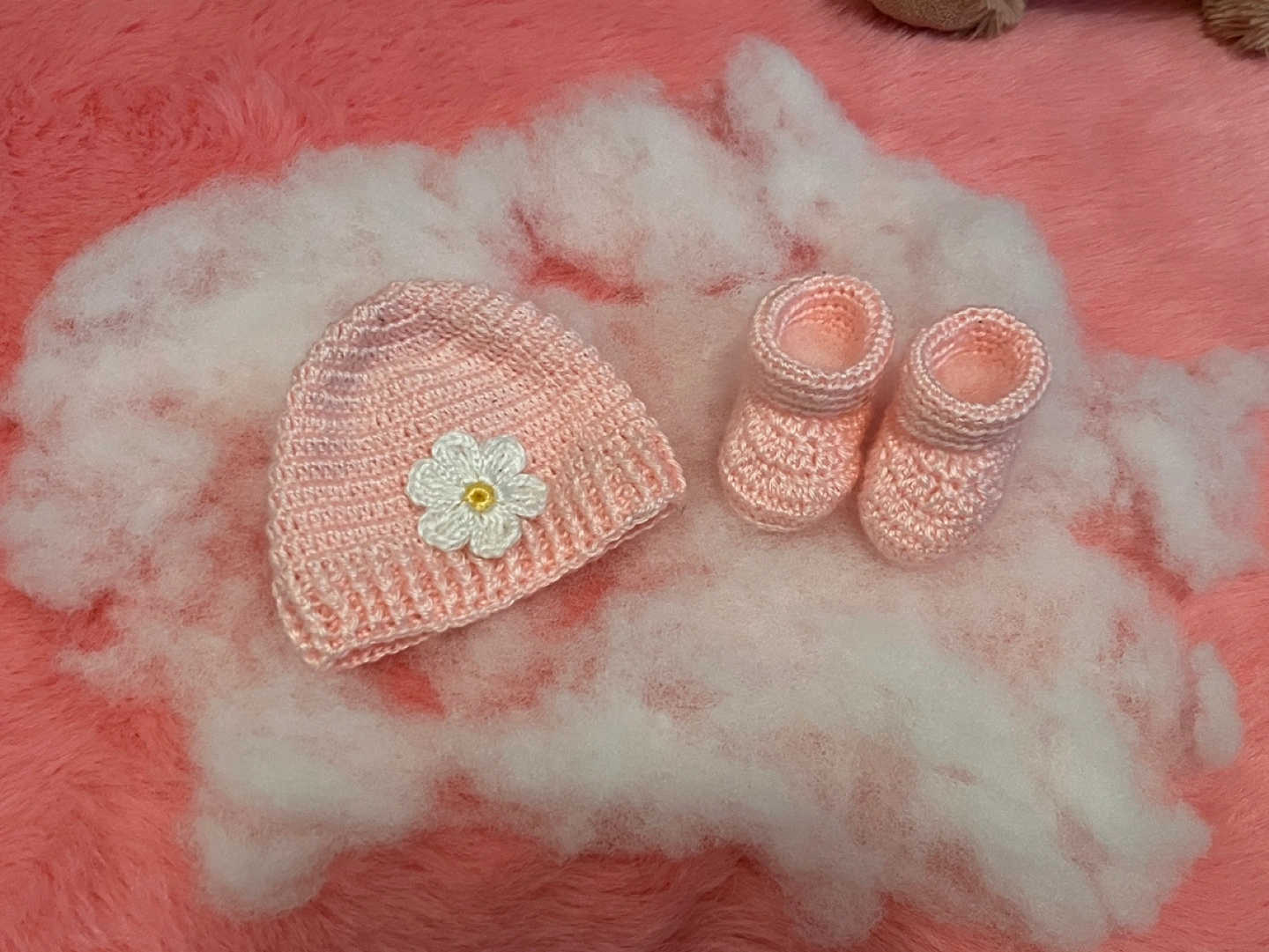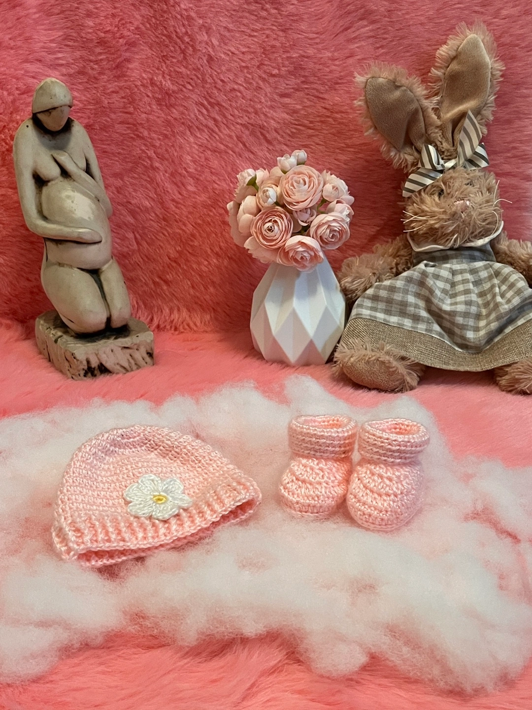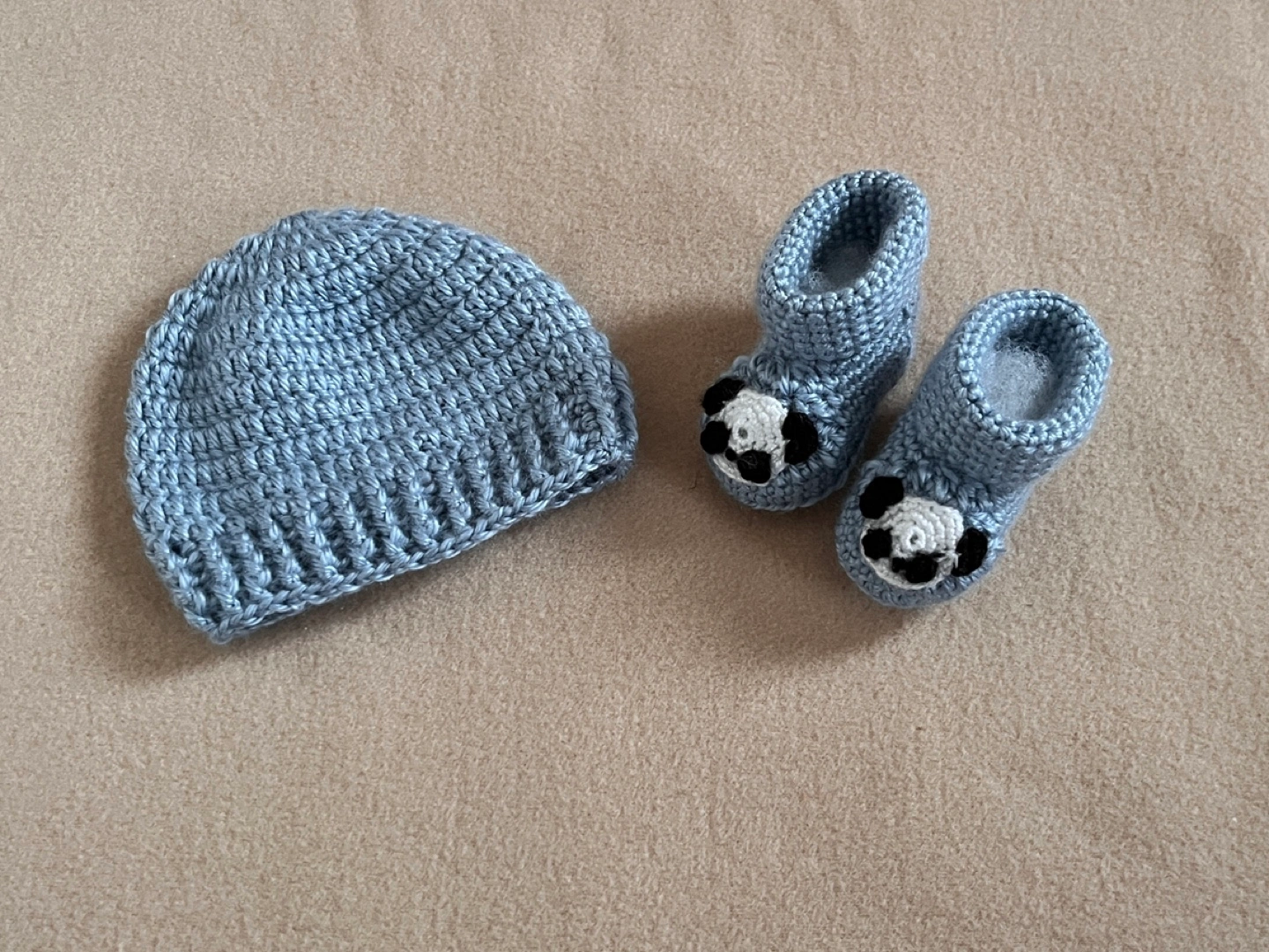 Adorable handmade baby hat and booties set. Perfect for newborn photoshoots or everyday wear. Soft and cozy material. One set in light blue with panda faces on booties, another in light pink with flower detail.