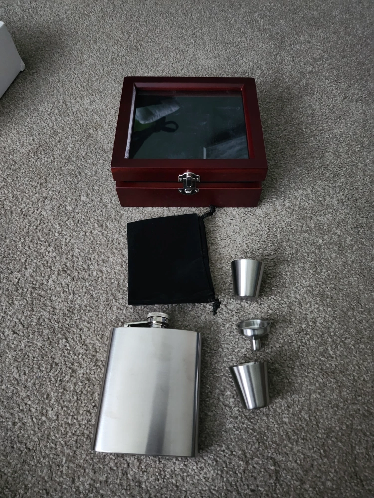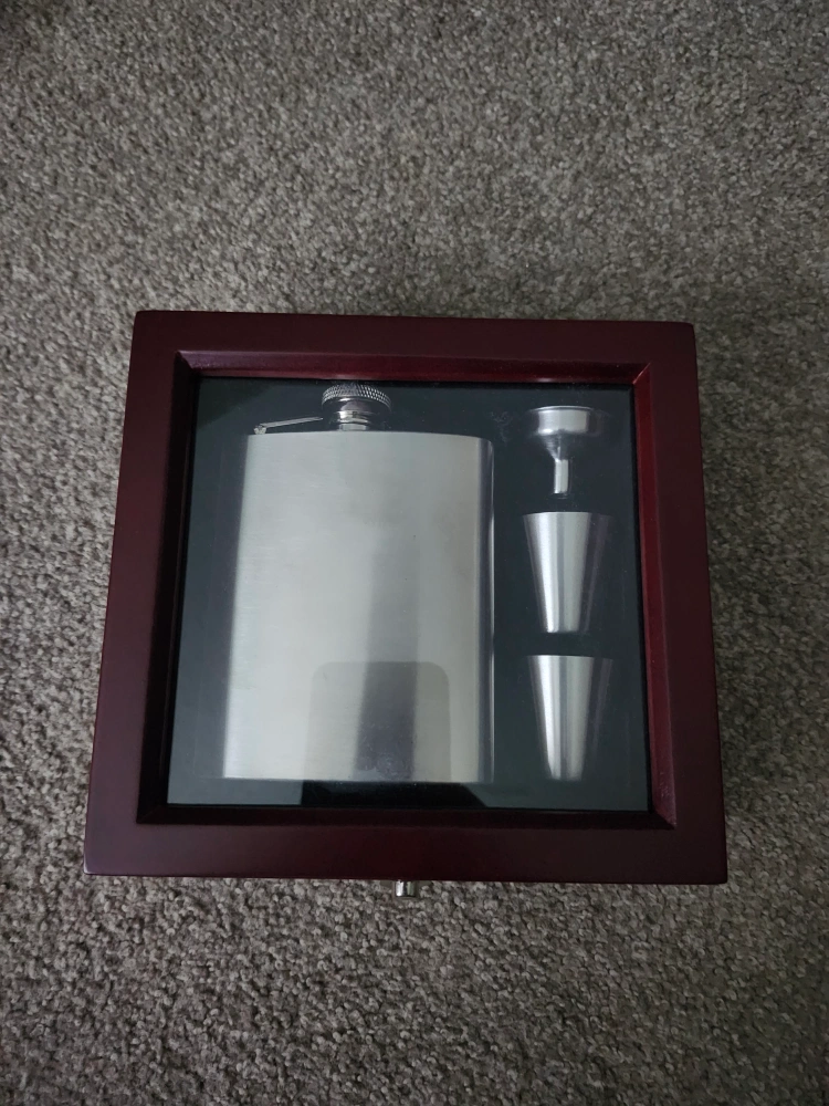 New hip flask gift set. Includes flask, two shot glasses, funnel, and wooden presentation box. Perfect gift.