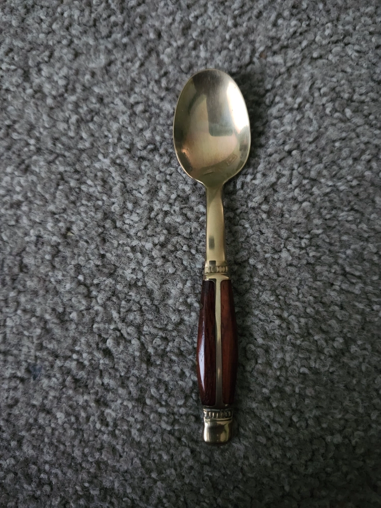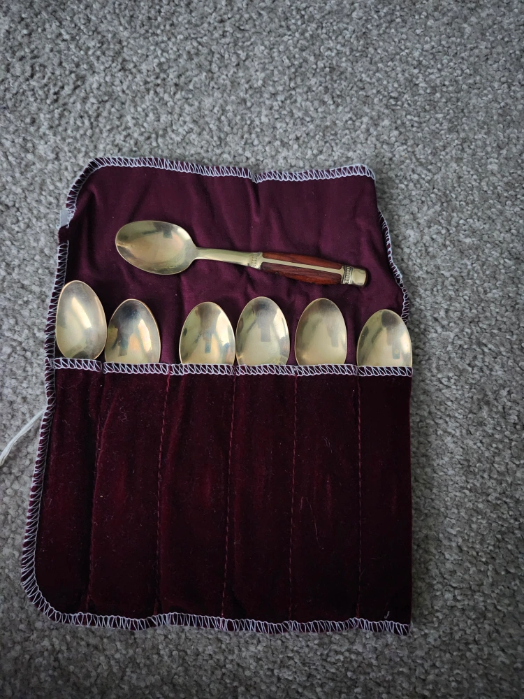 7 BRASS AND TEAK TEA SPOONS WITH CASE.